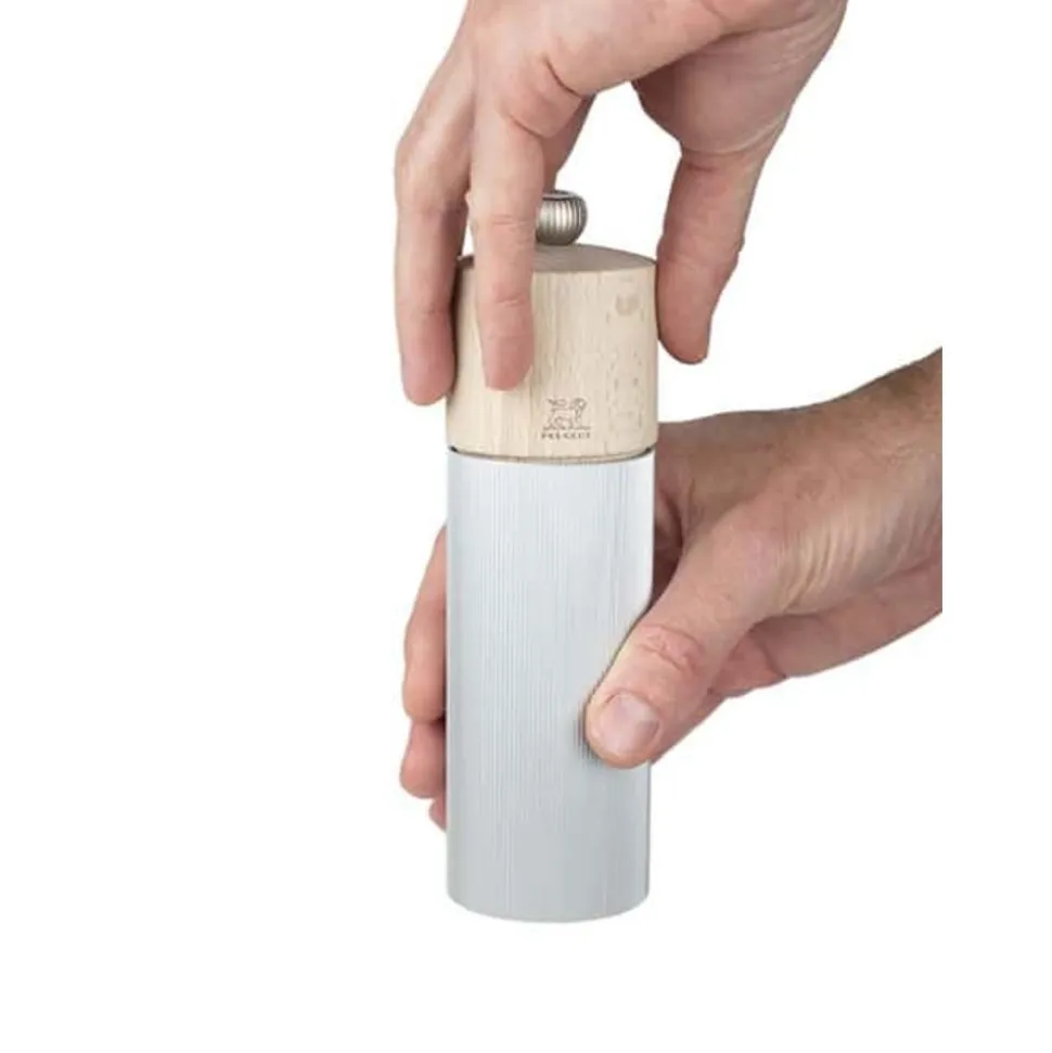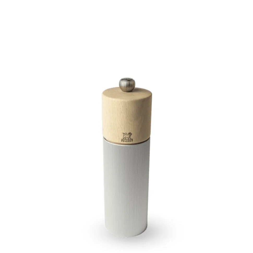 Het spel van de materialen, blank hout en aluminium, benadrukt het eigentijdse ontwerp van deze handmatige pepermolen van Peugeot.