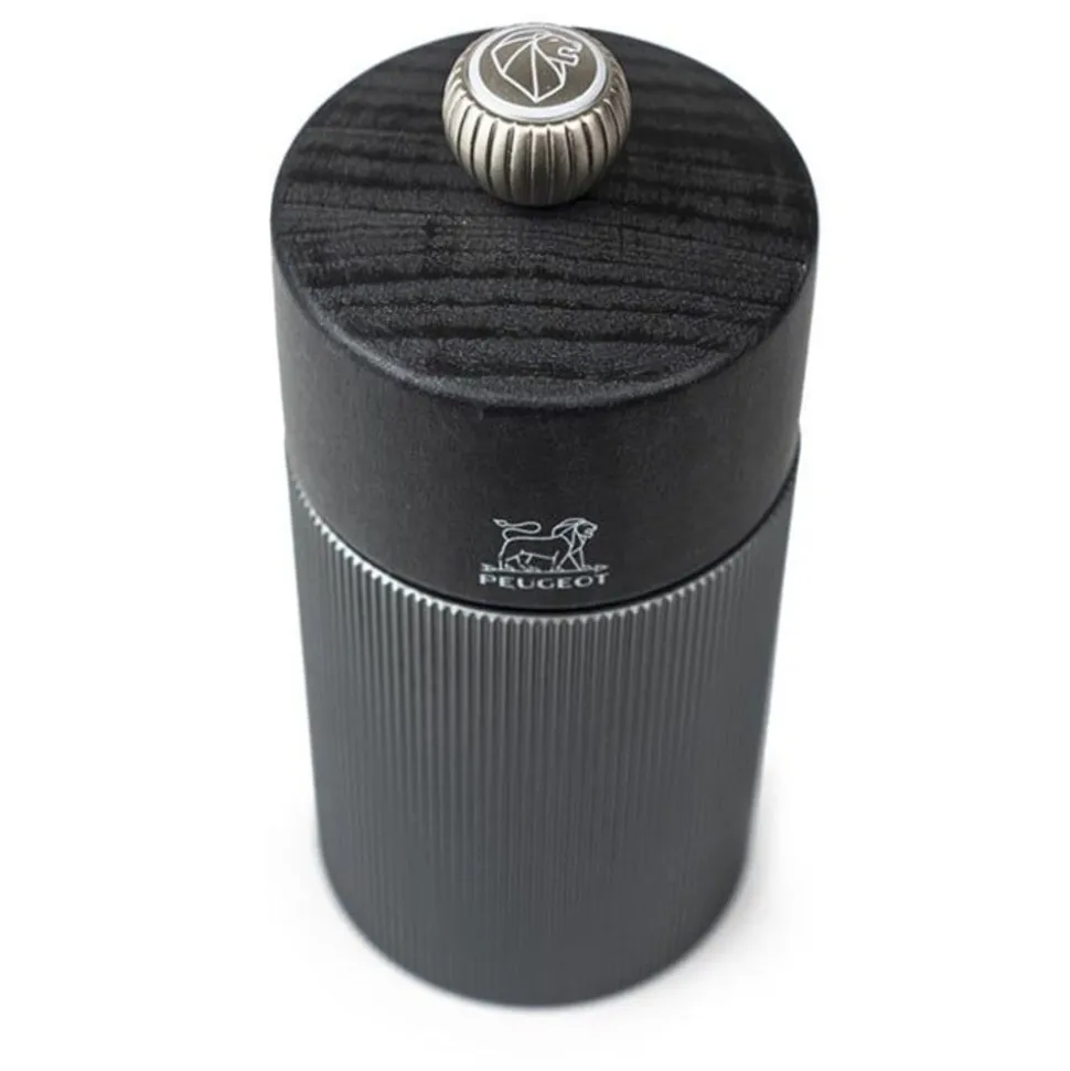 De regenboogachtige tint van de body in aluminium past perfect bij de subtiel metaalachtige grafietkleur van de kop van hout (met het PEFC-keurmerk). Hij is vervaardigd in Frankrijk en weerspiegelt eveneens de vakkennis van Peugeot: het stalen maalwerk dat speciaal is ontworpen voor het malen van peper, heeft een onbeperkte garantie en de knop biedt een eenvoudige en efficiënte instelling van de maalgraad (hoe strakker hij is aangedraaid, hoe fijner de maalgraad van de peper).