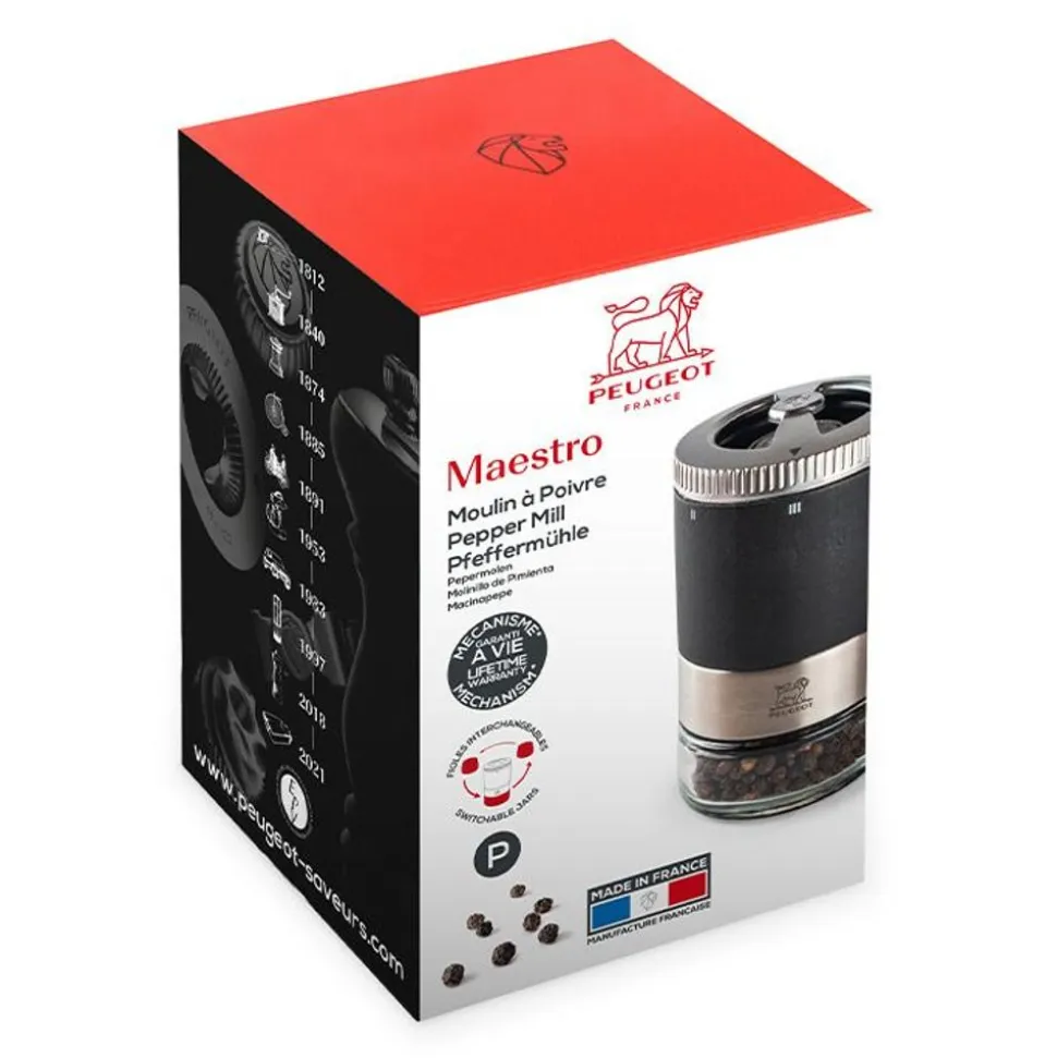 Met zijn houten behuizing en glazen schroefreservoir vormt de Maestro het pronkstuk van Peugeots peperbar, en dankzij het gepatenteerde u’Select-systeem pas je de maalgraad in een handomdraai aan van fijn naar grof. De molen wordt geleverd met fruitige zwarte kampotpeper, apart verpakt in een vershoudzakje voor optimale bewaring van het aroma.
