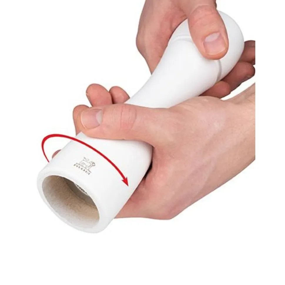 De mat witte kleur van deze manuele zoutmolen Tahiti onthult al zijn charme in dit stuk. Toch trekt Tahiti nog discreet alle aandacht door zijn slanke ronding die zorgt voor een goede grip. Deze molen, volledig uit hout, herbergt het efficiënte Peugeot-maalwerk met onbeperkte garantie. De knop bovenaan laat u toe om de maalgraad in te stellen: hoe vaster u hem aandraait, hoe fijner de maalgraad. Deze elegante zoutmolen Tahiti zal makkelijk zijn plaats vinden op uw tafel of in uw keuken.