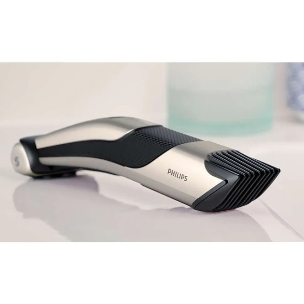 De geïntegreerde trimmer en instelbare kam met 5 lengte-instellingen is ontworpen met meer vermogen en is geschikt voor zelfs het dikste haar. De stalen mesjes van de trimmer schuiven licht tegen elkaar en slijpen zichzelf tijdens het trimmen zodat ze extra scherp en effectief blijven. De mesjes hebben afgeronde uiteinden voor een zacht contact met de huid om krassen te voorkomen. Om uw gewenste haarlengte te houden of voor een natuurlijke look stelt u de kam in op een lengte van 3 tot 11 mm. U kunt de andere kant van het scheersysteem gebruiken voor een gladder resultaat.