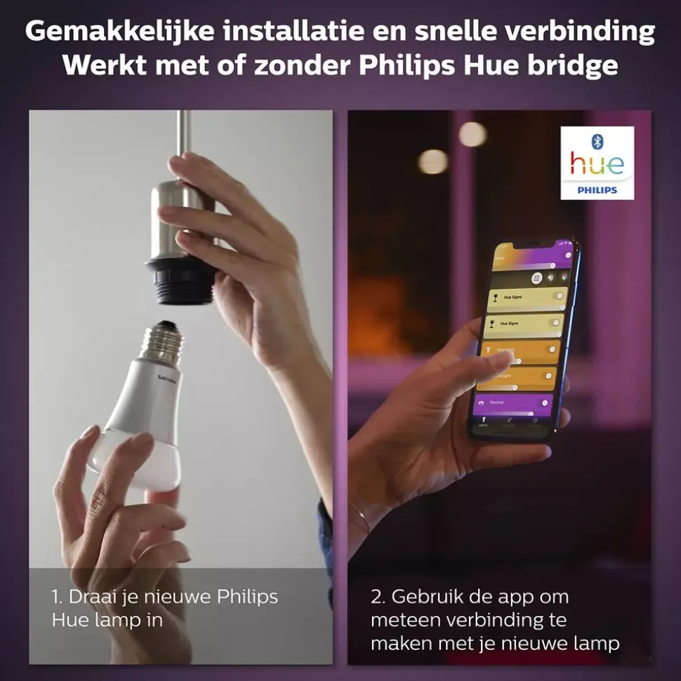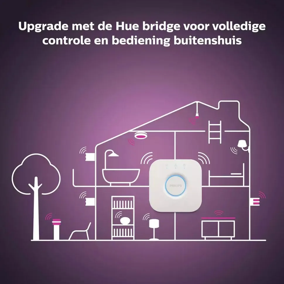Voeg een Hue Bridge (afzonderlijk verkrijgbaar) toe aan uw slimme LED-lampen en ervaar alle mogelijkheden van Philips Hue. Met een Hue Bridge kunt u tot maar liefst 50 lampen toevoegen om in uw hele huis het perfecte licht in te stellen. Stel routines in om alle slimme verlichting in het huis te automatiseren. Bedien uw lampen ook als u niet thuis bent of voeg accessoires toe, zoals bewegingssensoren en slimme schakelaars.