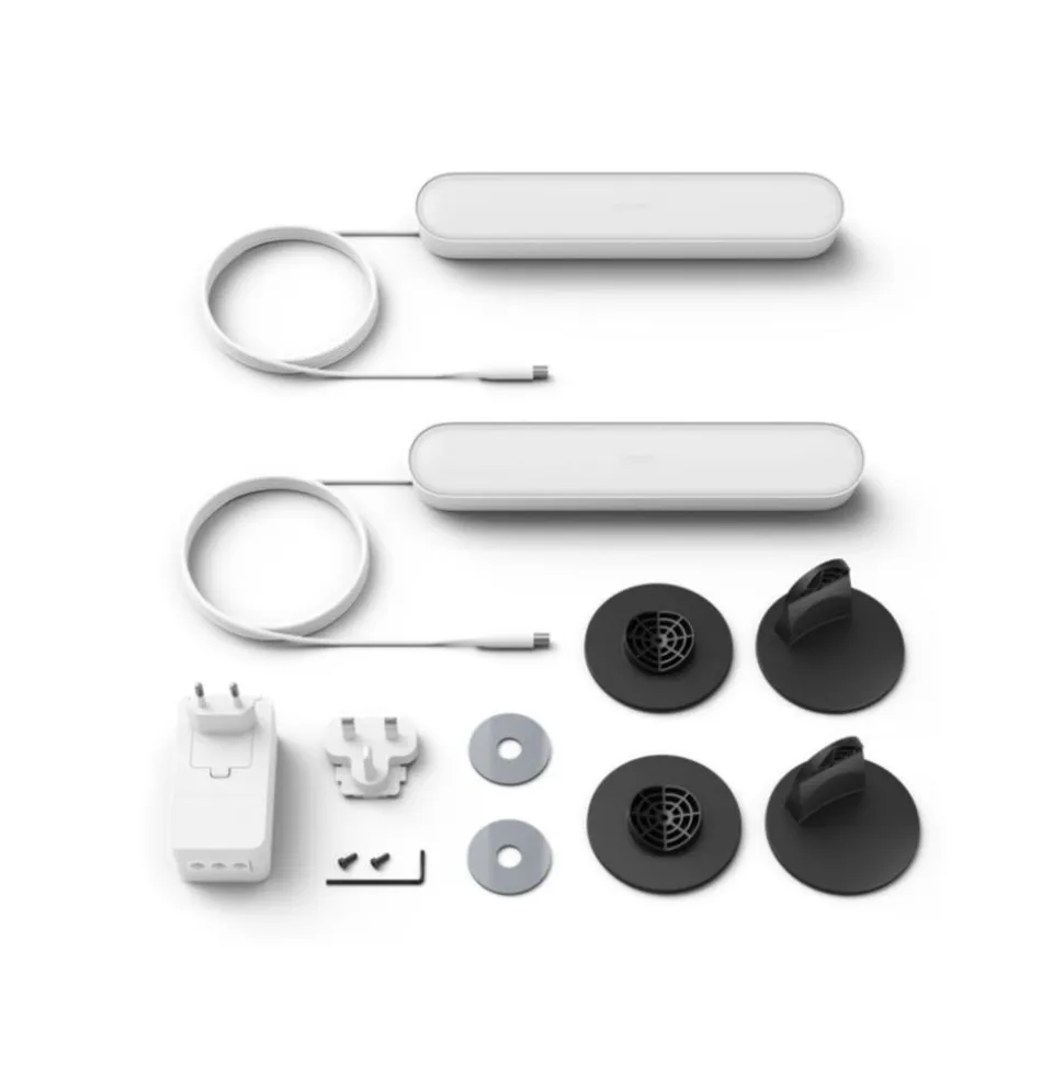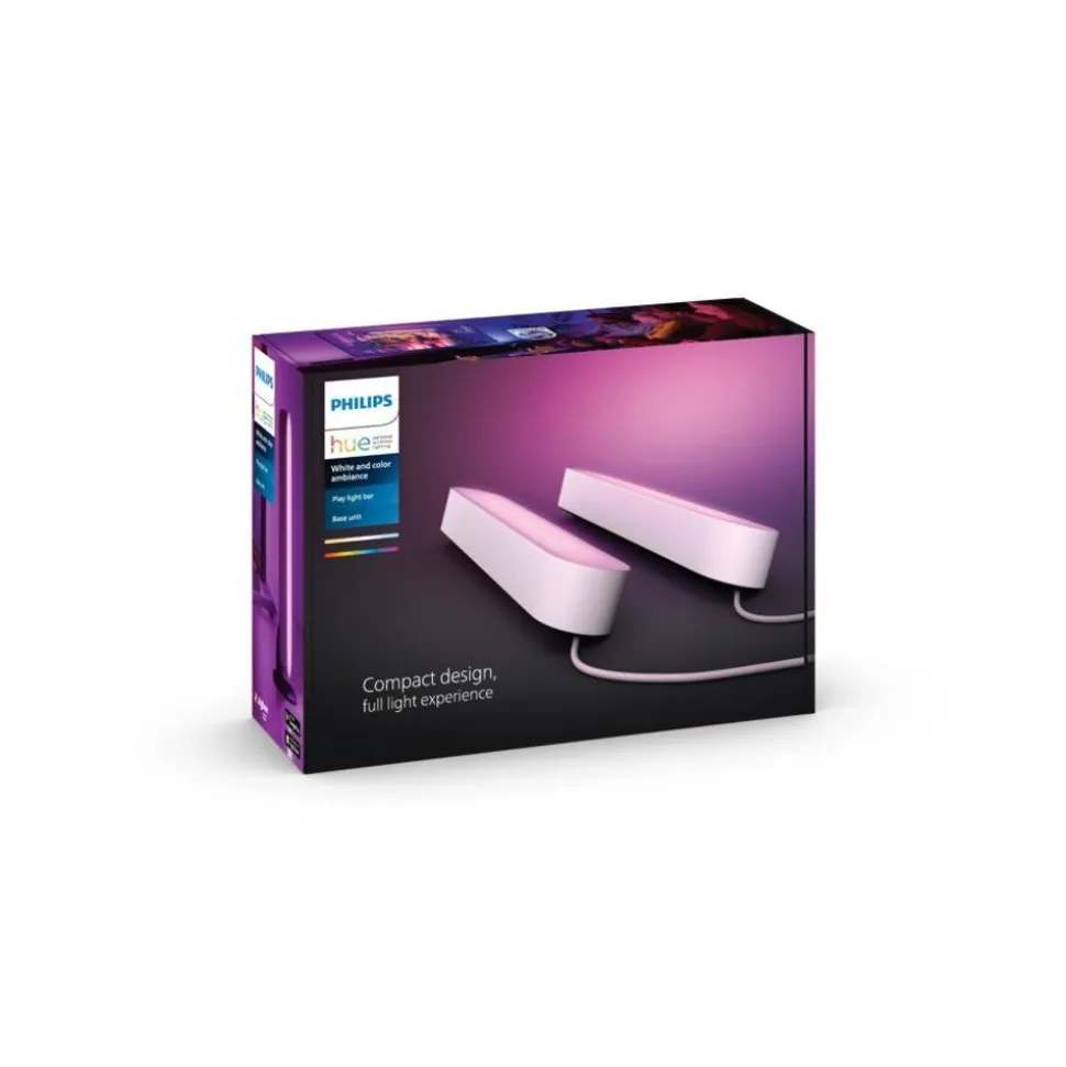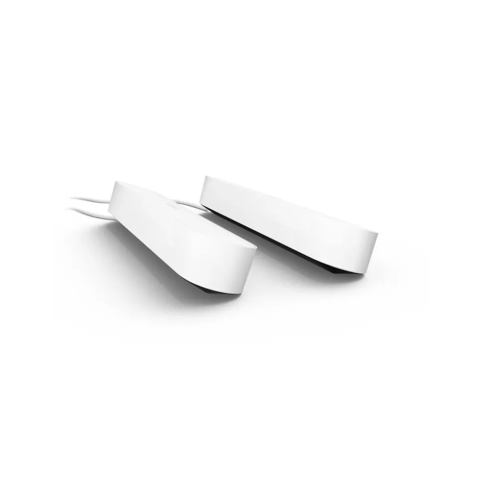 Creƫer een gloed van gekleurd slim licht met het slanke ontwerp van de witte Hue Play tafellamp. Deze verpakking bevat twee Play tafellampen en een voeding waarop je tot drie lampen kunt aansluiten. Je kunt hem rechtop zetten, horizontaal neerleggen of aan de achterkant van je tv bevestigen met de bijgeleverde steunen.