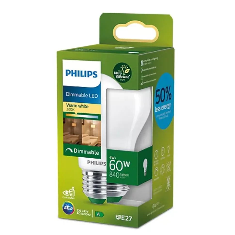 Philips UltraEfficient LED-lampen geven mooi licht, gaan bijzonder lang mee (50.000 uur) en besparen onmiddellijk en aanzienlijk veel energie. Je hoeft de lamp minder vaak te vervangen en profiteert van licht dat prettig is voor je ogen door het EyeComfort-ontwer