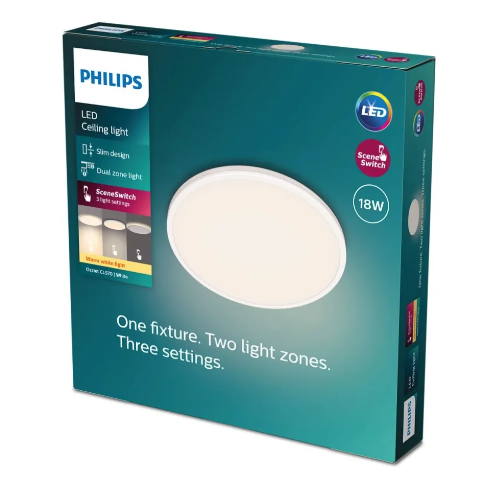 Het is nog nooit zo eenvoudig geweest om de sfeer in je woonkamer aan te passen. Met de Philips SceneSwitch LED-plafondlamp met twee lichtrightingen kun je gemakkelijk de sfeer bepalen met drie unieke instellingen. Door de combinatie van hoofd- en linaire randverlichting beschik je over opties die perfect zijn voor de momenten waarop je samenkomt met anderen, moet concentreren of wanneer je gezelligheid wilt creëren. Er is geen dimmer of installatie nodig, je hebt alleen jouw bestaande schakelaar nodig.
