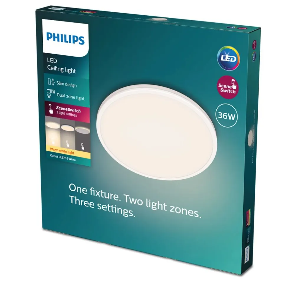 Het is nog nooit zo eenvoudig geweest om de sfeer in je woonkamer aan te passen. Met de Philips SceneSwitch LED-plafondlamp met twee lichtrightingen kun je gemakkelijk de sfeer bepalen met drie unieke instellingen. Door de combinatie van hoofd- en linaire randverlichting beschik je over opties die perfect zijn voor de momenten waarop je samenkomt met anderen, moet concentreren of wanneer je gezelligheid wilt creëren. Er is geen dimmer of installatie nodig, je hebt alleen jouw bestaande schakelaar nodig.