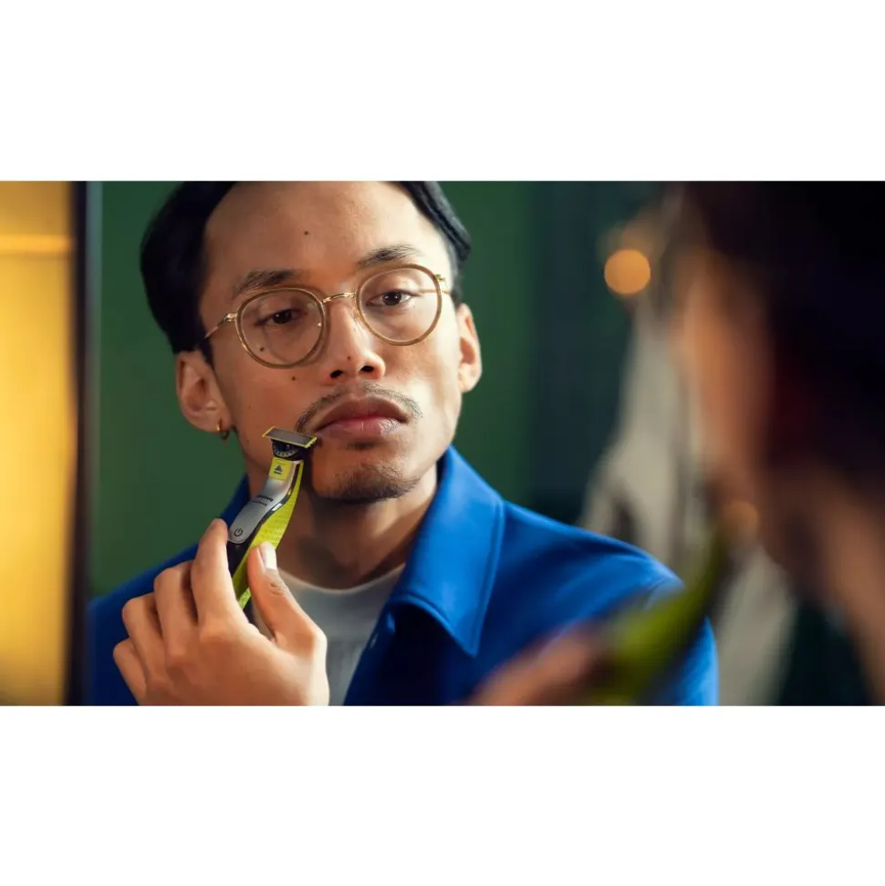 De Philips OneBlade is een revolutionaire nieuwe hybride styler die op elke haarlengte strakke lijnen en randen kan trimmen of scheren. Dankzij het dubbele beschermingssysteem – een glijcoating en afgeronde uiteinden – wordt scheren gemakkelijker en comfortabeler. Het scheerapparaat heeft een snelbewegend mesje dat tot 12.000 keer per minuut kan bewegen, waardoor het geschikt is voor elke haarlengte.
