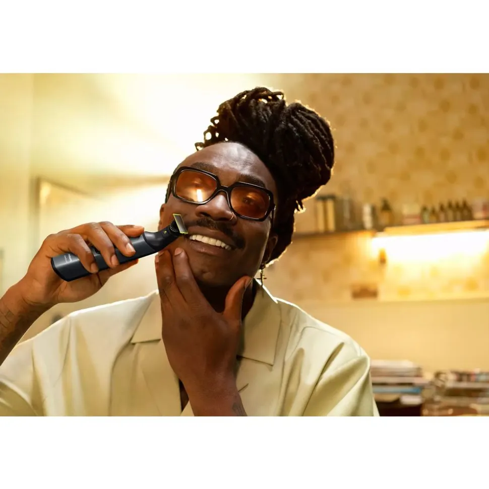 OneBlade volgt de contouren van je gezicht zodat je alle plekken eenvoudig en comfortabel kunt scheren. Style je eigen contouren en strakke lijnen door het dubbelzijdige mes in elke gewenste richting te bewegen.
