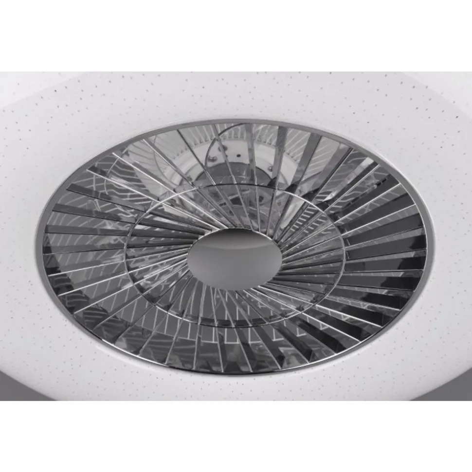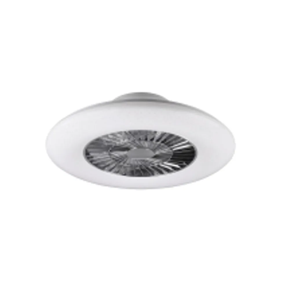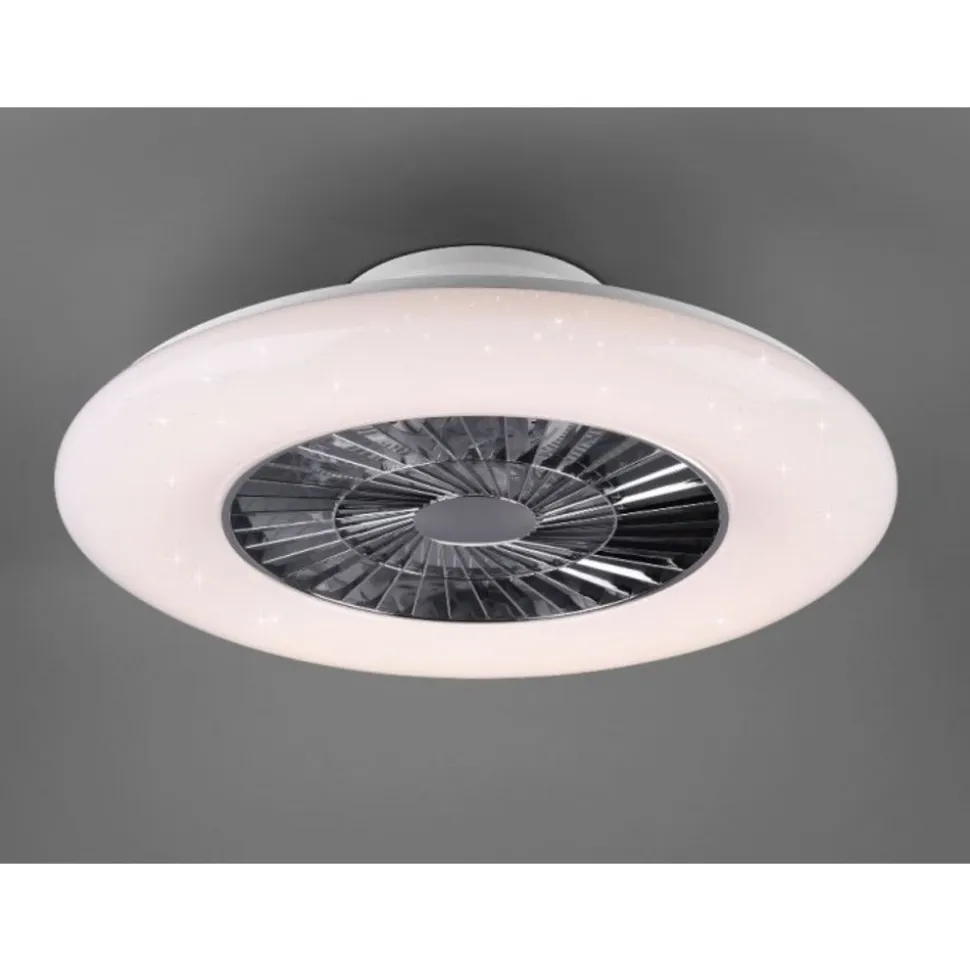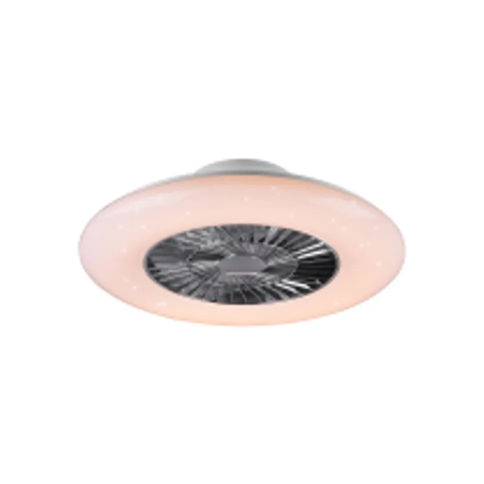 Een mooie ventilator voor het plafond uit de collectie van Trio. Deze moderne ventilator is gemaakt van kunststof in de kleur chroom en mat wit. In deze plafondventilator zit een ingebouwde LED lamp met een wattage van 40W die ook nog eens traploos gedimd kan worden met de geïntegreerde dimmer en ook de lichttemperatuur kan worden aangepast (3000 – 6500K). De ventilator is geschikt voor montage aan het plafond en heeft 3 snelheidsniveaus die ingesteld kunnen worden met de meegeleverde afstandsbediening. Ook heeft dit product handige functies zoals een timer, een nachtlampfunctie en twee lichtpunten die apart geschakeld kunnen worden. Het opvallende armatuur heeft een schitterend sterreneffect.