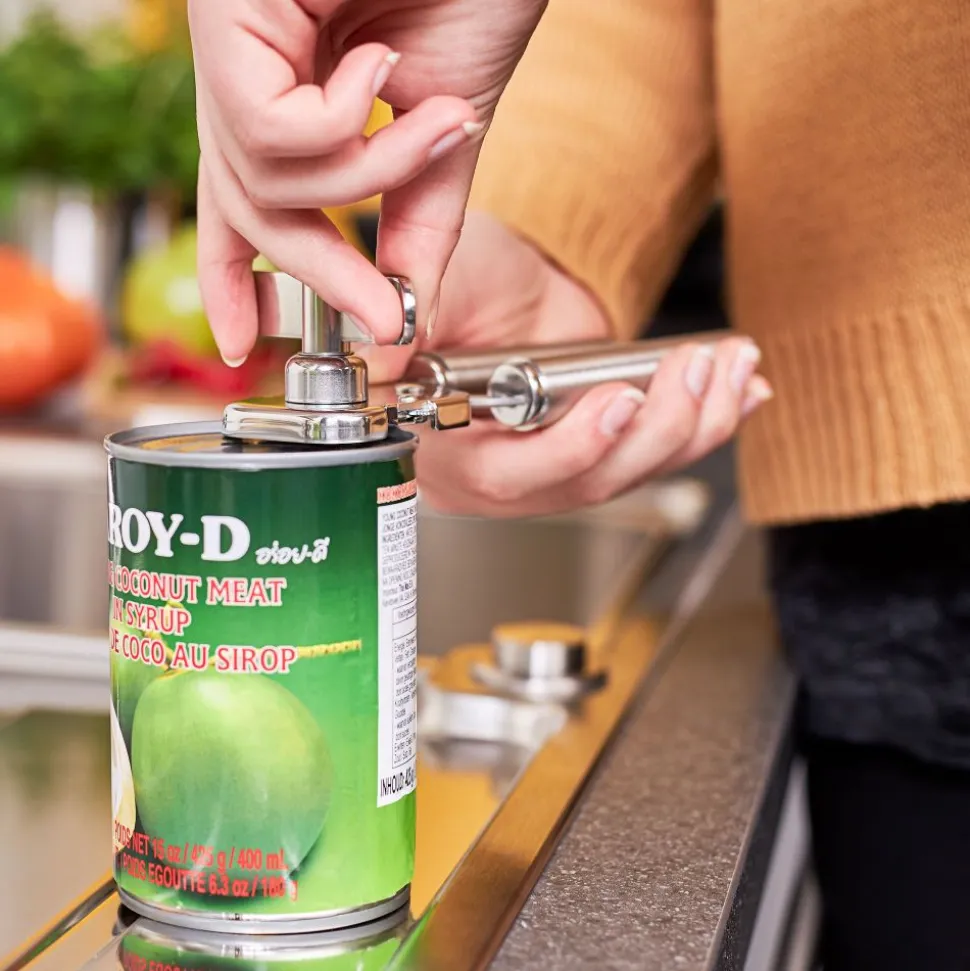 Geheel vervaardigd uit roestvrij staal. Opent blik soepel en gemakkelijk. Laat geen scherpe randen achter op deksel of blikrand en komt niet in contact met inhoud. Het deksel kan vervolgens opnieuw worden gebruikt voor opslag. Ergonomisch gevormde duimschroef voor soepel en moeiteloos draaien.