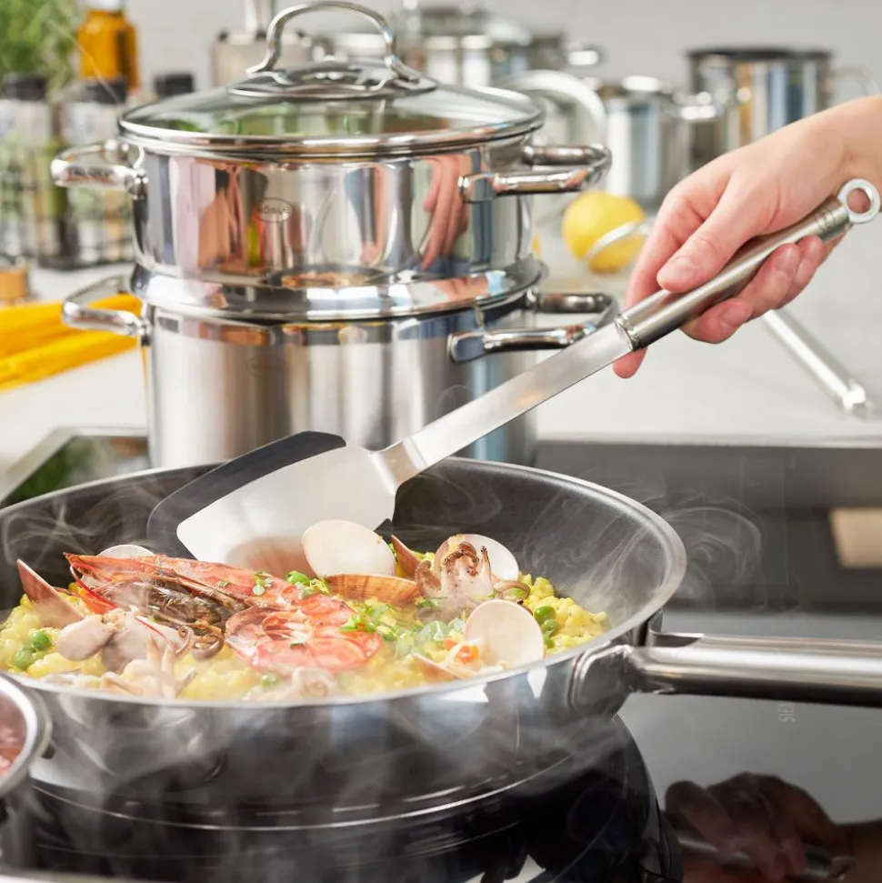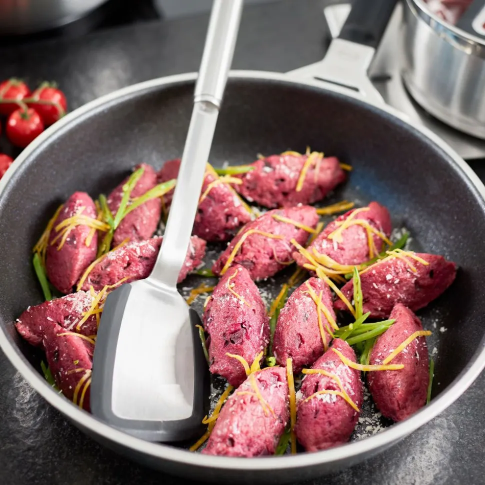 Voor het draaien, verdelen, optillen en portioneren in gecoate pannen. Hittebestendig tot 220 °C/428 °F. Vaatwasserbestendig. Duurzame verbinding van roestvrij staal en siliconen.