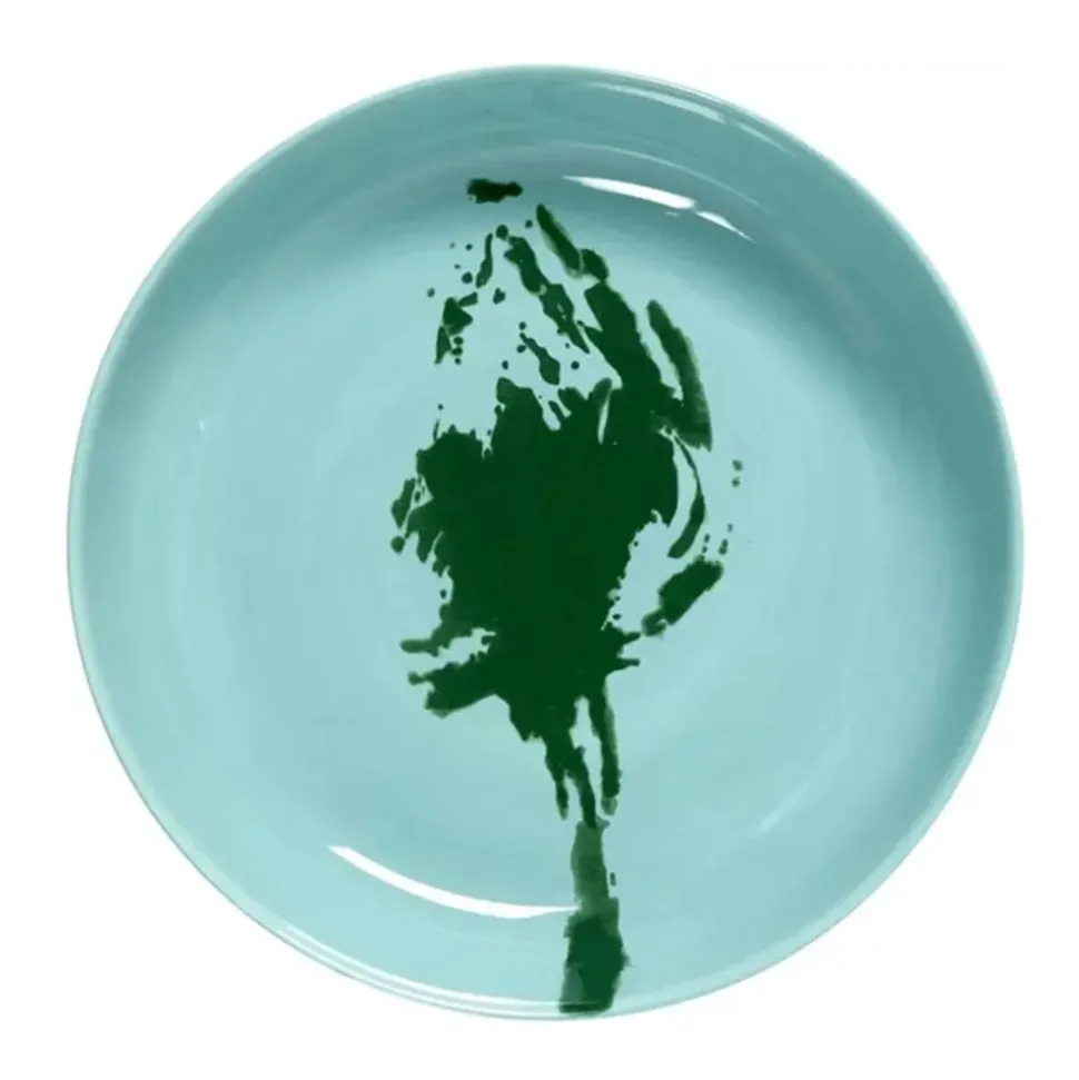 Turquoise aardewerken bord uit de FEAST-collectie. De groene tekening maakt het een echte eyecatcher. Met de speelse patronen en gedurfde kleuren van deze collectie creƫer je een luxueuze eetervaring.
