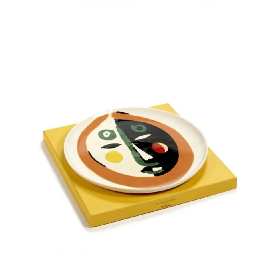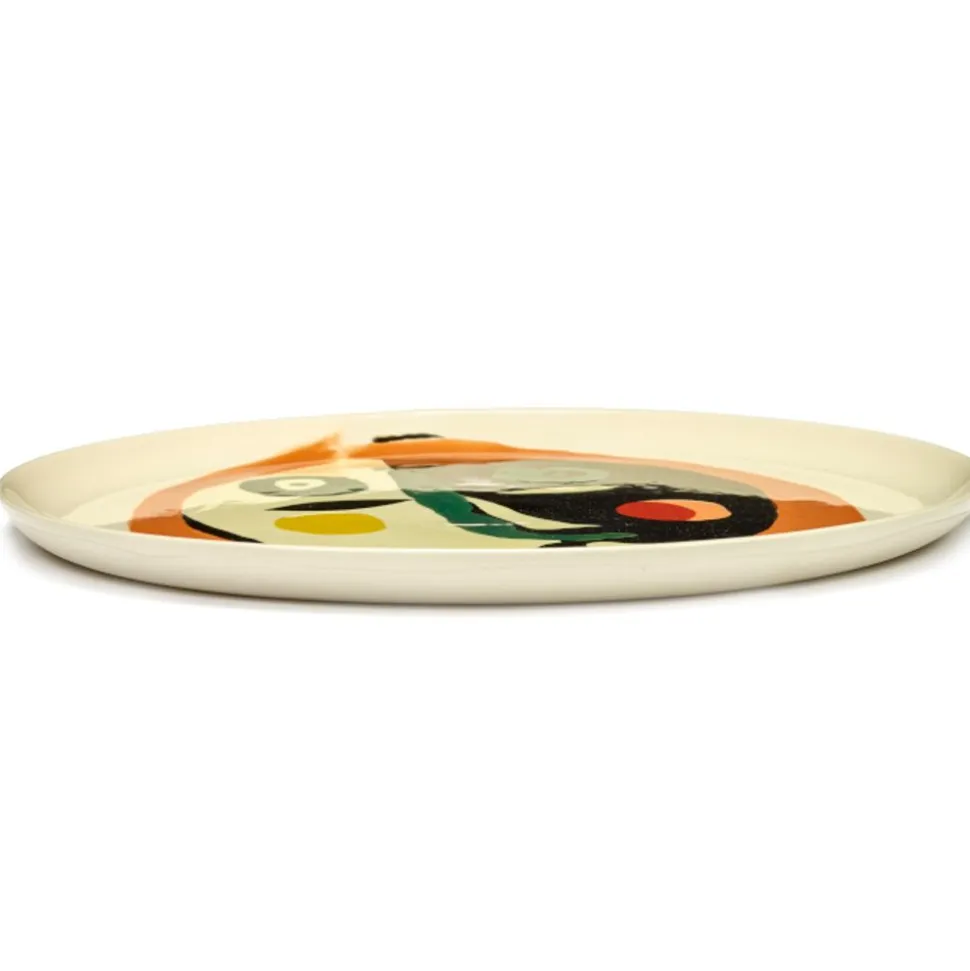Aardewerken serveerbord in crème kleur met oranje, groene en zwarte schildering van een gezicht.