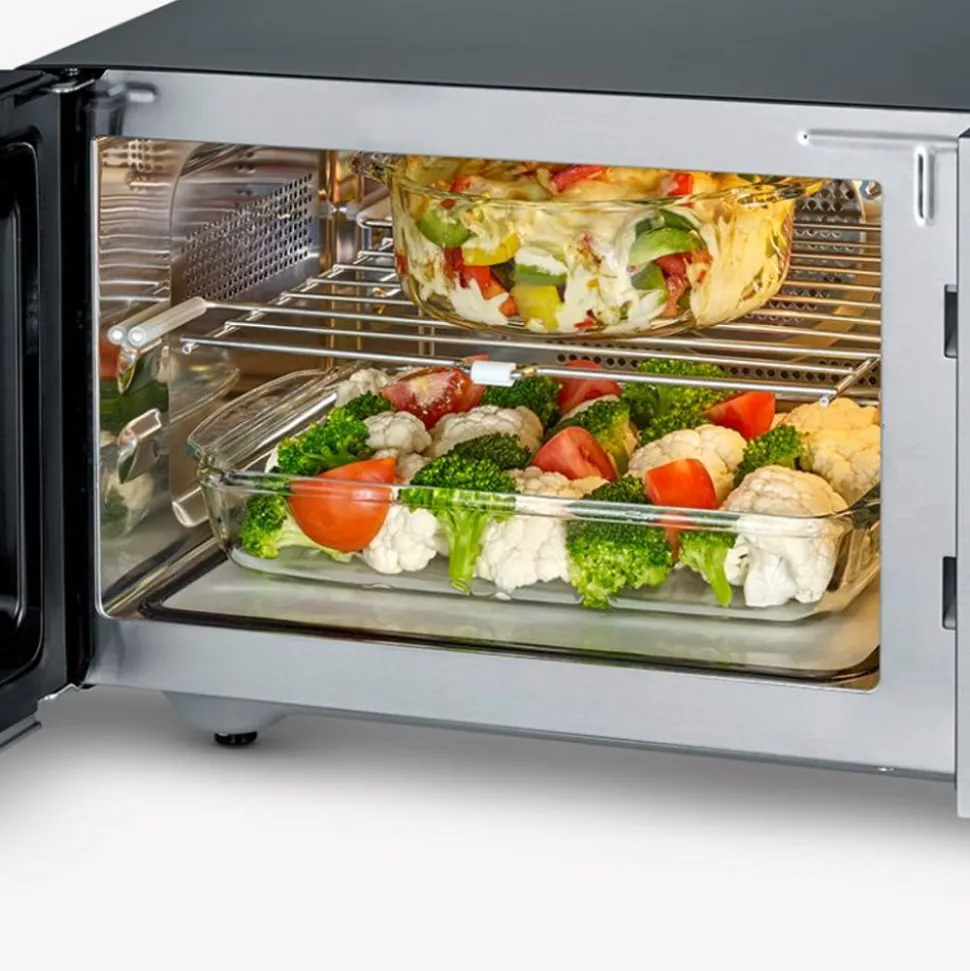 Innovatieve glasbodemtechnologie – verwarmen, koken en bakken zonder draaiplateau! Vierkante braadpannen en grote borden zijn geen probleem voor de MW 7758 dankzij het tot 80% grotere bruikbare oppervlak*. Dankzij de innovatieve keramische bodemtechnologie met magnetronreflector heeft deze magnetron helemaal geen conventioneel draaiplateau nodig en garandeert perfecte resultaten. Dankzij de geïntegreerde grillfunctie en de ultrahete luchtfunctie met maximaal 230°C kunt u gemakkelijk bakken of diverse andere gerechten bereiden. Het aparte rek maakt zelfs koken op twee niveaus mogelijk, zodat twee gerechten tegelijk kunnen worden bereid. De vlakke keramische bodem garandeert een absoluut moeiteloze reiniging en kan eenvoudig met een vochtige doek worden schoongeveegd. De bediening is eenvoudig: dankzij het LEDTouch-display en het “Easy-Select”-concept zijn alle functies snel toegankelijk. De toetstonen kunnen naar wens worden in- of uitgeschakeld. 8 automatische programma’s, 10 vermogensniveaus en ontdooien op gewicht of tijd maken het totaalplaatje compleet. Goed om te weten: Drie favoriete gerechten kunnen worden geprogrammeerd en te allen tijde met één druk op de knop worden opgeroepen.