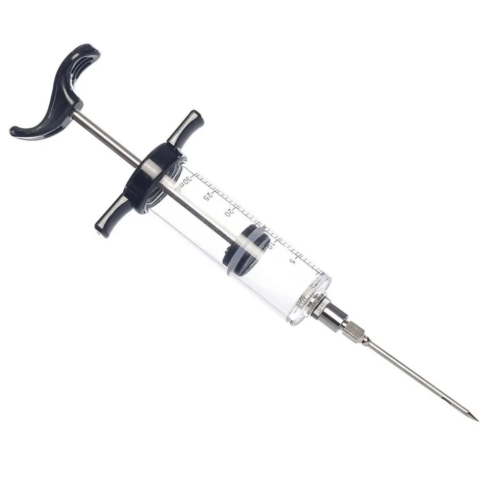 Vlees marineren is heel eenvoudig met deze marinade-injector. Vul de injector met een lekkere marinade, steek de naald in het vlees en spuit de marinade erin. Na gebruik kan de injector gewoon in de vaatwasser . RVS naald, 30 ml.