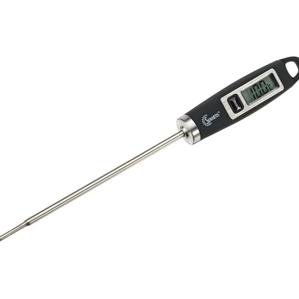 Digitale huishoudthermometer (-40°C -->- 200°C) van Mingle. Deze allroundthermometer kan oa gebruikt worden als vleesthermometer, diepvriesthermometer, wijnthermometer, bakthermometer etc.. In te stellen op °C of °F. Batterij ingesloten.
