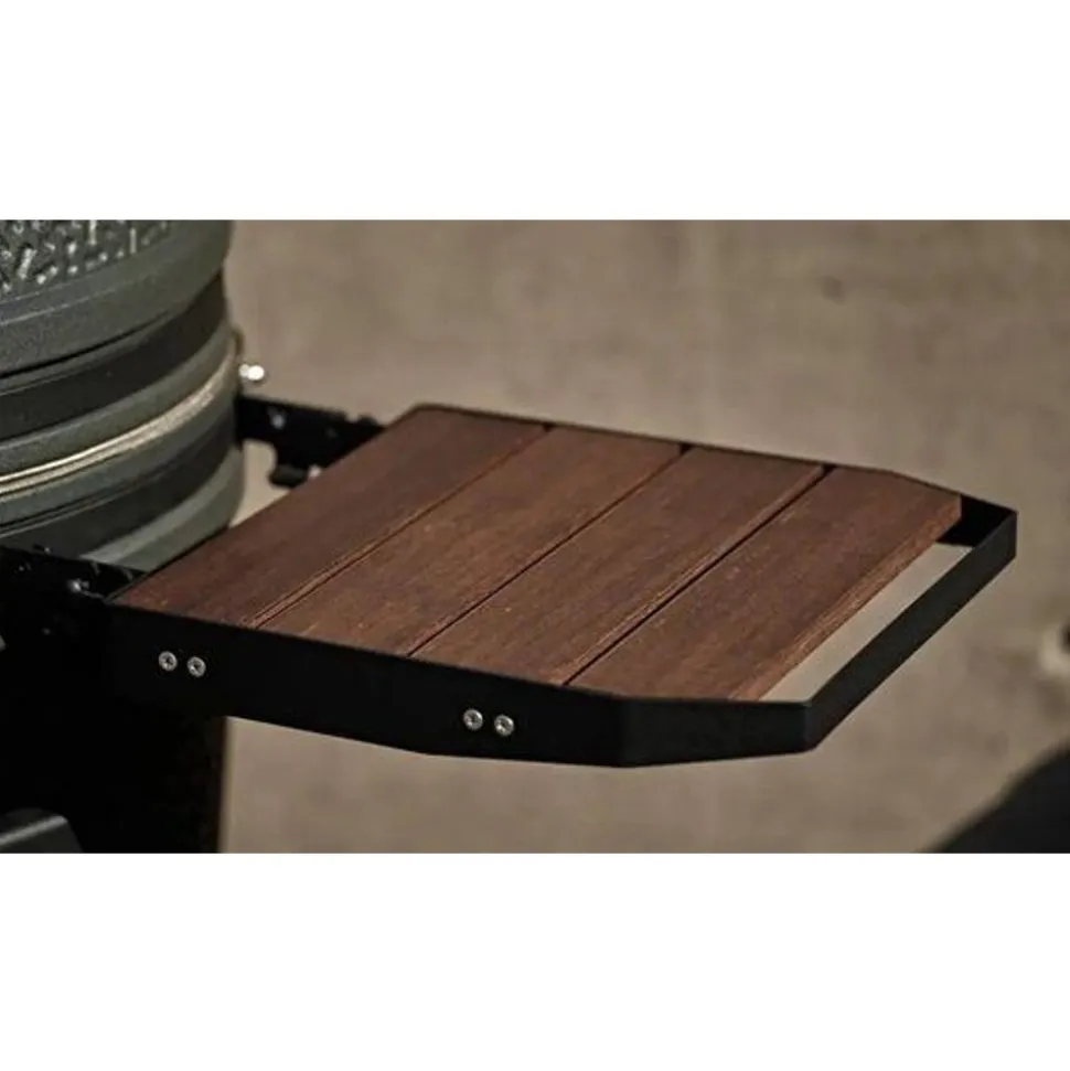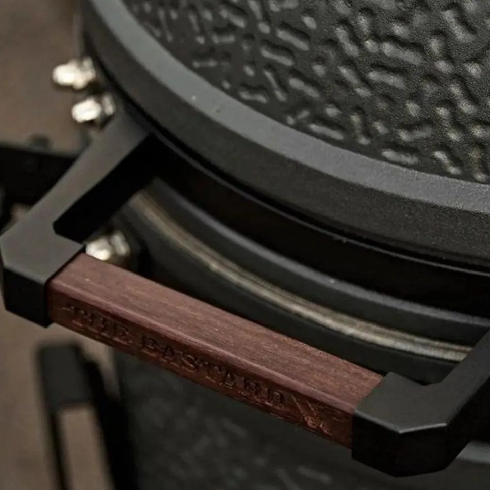 Een dik stevig handvat van gepoedercoat geperst RVS, dat klinkt net zo solide als dat het voelt. Ondanks de industriële look is het een stuk duurzamer dan alleen hout. Ze hebben gekozen om toch nog dit af te maken met herkenbare geoliede bamboe. Verstevigde zijtafels Bij veel kamado merken werken ze met houten zijtafels, zo ook bij dit Nederlandse merk. Bij de VX hebben ze ten opzichte van de andere Bastard modellen een stalen frame om het hout heen gemaakt. Dit voor extra stevigheid. Er zitten ook een speciaal stopscharnier in het tafeltje verwerkt zodat deze je keramiek ook beschermd.
