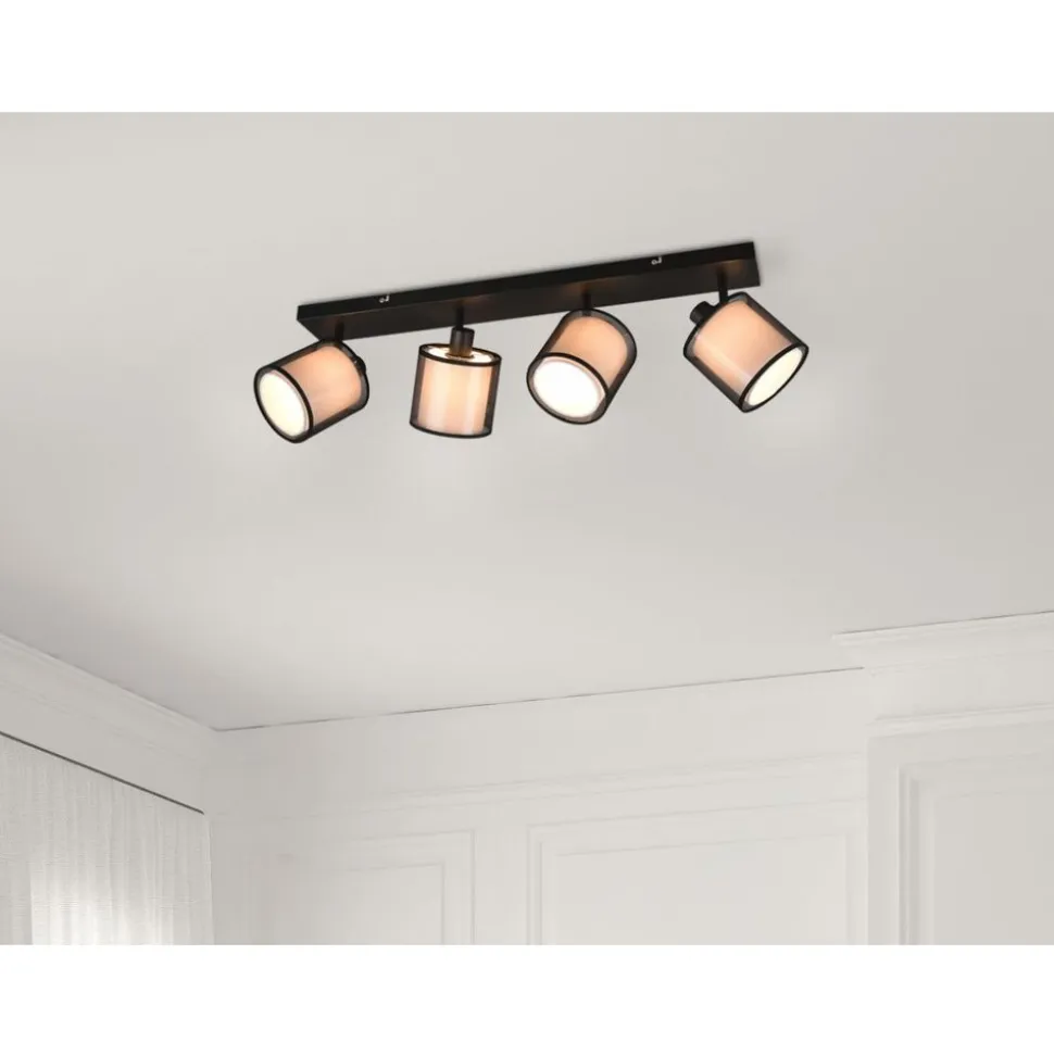 Met hun stoffen kappen zijn de lampen van de serie BURTON het toonbeeld van behaaglijkheid. Het huiselijke licht van de viervlammige plafondlamp, die met de twee verschillend gekleurde kappen een gezellige sfeer schept, zet overal bijzondere lichtaccenten, waar deze gewenst en benodigd zijn. De moderne combinatie van een witte stoffen binnenkap en een transparante zwarte kunststof buitenkap werkt individueel en verfrissend en kan op verschillende manieren in moderne woonstijlen worden geïntegreerd. Voor een energiebesparende verlichting is het gebruik van een ledlichtbron aanbevolen. Deze zijn een optimaal alternatief voor gewone halogeenlampen en staan voor een hoge lichtkwaliteit en een energiebesparing van tot 80%. Bovendien profiteert u bij ledlichtbronnen van een lange levensduur, een geringe warmteontwikkeling en spaart tegelijkertijd het milieu.