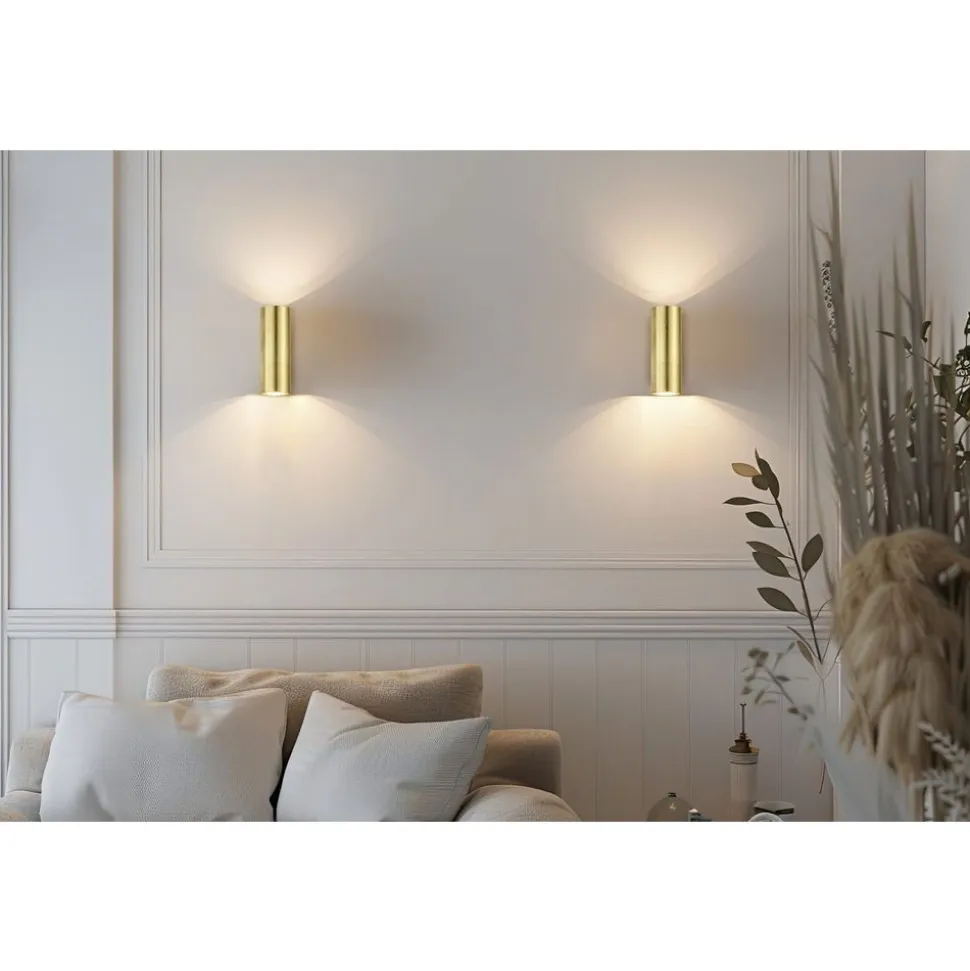 Wandlampen creëren een indirect en sfeervol licht. Maak je look compleet met de CLEO wandlamp van metaal met gouden folie. De buisvormige armatuur met op- en neerwaartse verlichting dient als decoratief of oriëntatielicht en creëert een gezellige sfeer en stijlvolle verlichting aan het hoofdeinde van het bed, in de gang, naast de bank of tussen foto’s. De CLEO wandlamp heeft een afmeting van 16,5 x 6 cm en een projectie van 10 cm en kan worden uitgerust met twee GU10 lampen met een maximaal vermogen van 35 watt.