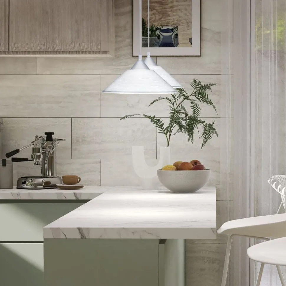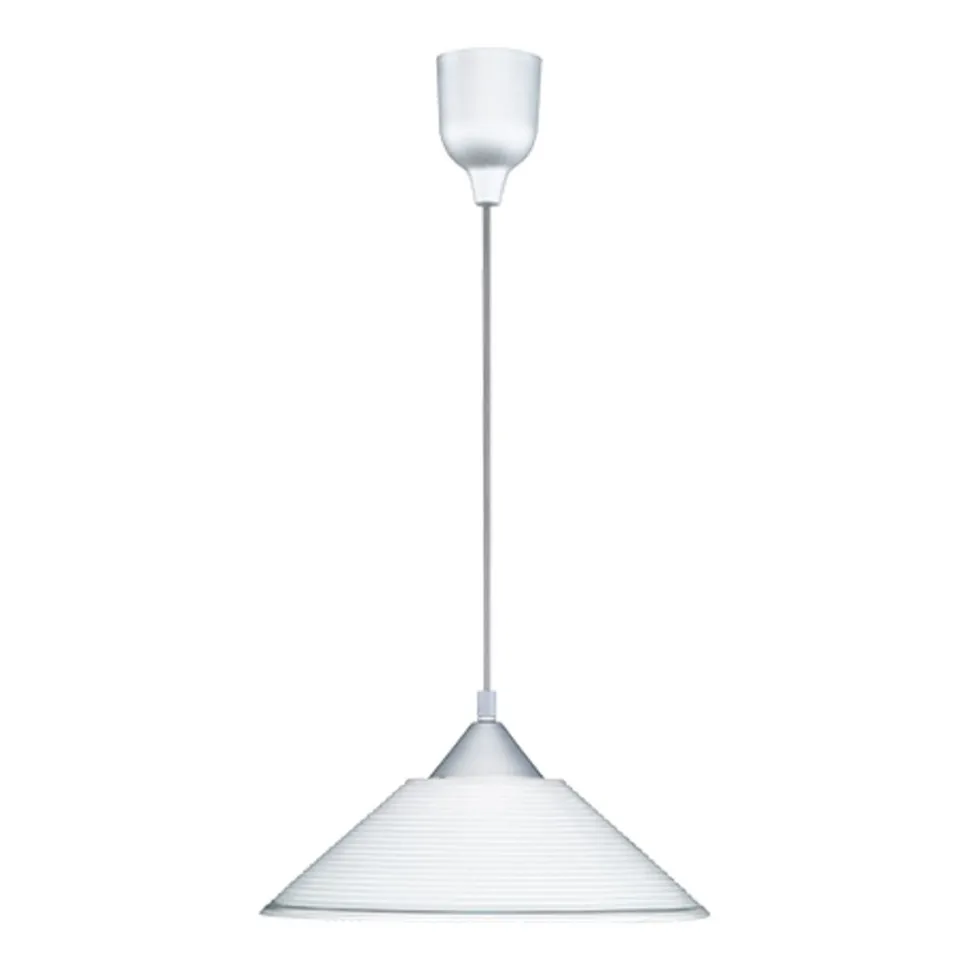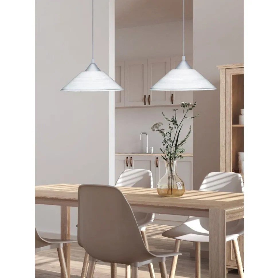 De DIEGO hanglamp creƫert met haar licht een aangename verlichting in je woonruimte en is bijzonder geschikt voor gebruik boven de eettafel of iets dergelijks. Met haar moderne ontwerp zorgt ze voor een homogene verlichting van kamers en oppervlakken. Het gegroefde glas van de lamp heeft een diameter van 30 cm en een hoogte van 15 cm, de totale lengte is 125 cm. De heldere binnenkant en het witte gegroefde glas aan de buitenkant passen zich moeiteloos aan elke woonstijl en elk kleurenconcept aan. Voor een energiebesparende verlichting is het gebruik van een ledlichtbron aanbevolen. Deze zijn een optimaal alternatief voor gewone halogeenlampen en staan voor een hoge lichtkwaliteit en een energiebesparing van tot 80%. Bovendien profiteert u bij ledlichtbronnen van een lange levensduur, een geringe warmteontwikkeling en spaart tegelijkertijd het milieu.