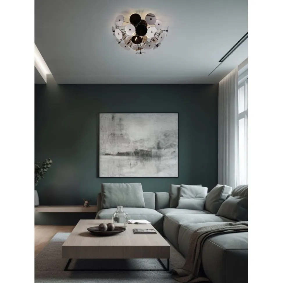Een modern accessoire voor je woon- of slaapkamer. Het opvallende ontwerp van de plafondlamp is gegarandeerd een echte blikvanger! Als hij aan is, biedt hij een geslaagd samenspel tussen licht en schaduw. Met een beetje fantasie doet de lamp denken aan een paardenbloem en past daarom perfect in een creatieve interieurstijl. Terwijl de glazen ruiten het licht weerkaatsen in een chroomdampcoating, vormt het matzwarte metaal een rijk genuanceerd kleurcontrast met het glas. Het gebruik van LED lichtbronnen wordt aanbevolen voor energiebesparende verlichting. Deze vormen een ideaal alternatief voor conventionele halogeenlichtbronnen en bieden een hoge lichtkwaliteit en energiebesparingen tot 80%. Met LED lichtbronnen profiteert u ook van een lange levensduur en een lage warmteontwikkeling, terwijl het milieu wordt beschermd.