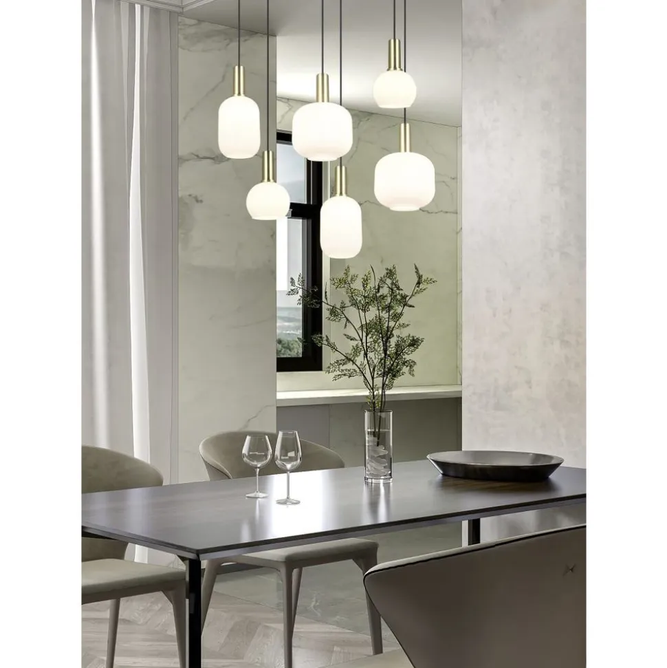 De veelzijdige glazen kappen van de hanglampen uit de DIVA-serie geven je interieur een bijzondere charme. Hangend boven een eettafel, salontafel of aanrecht zijn ze een indrukwekkende blikvanger die ieders aandacht trekt. De speciale vorm en het ontwerp van het glas verspreiden het licht zacht en niet-verblindend, waardoor een gezellig lichtspel ontstaat. Deze warme lichtsfeer, in combinatie met het tijdloze ontwerp, maakt van DIVA al snel een favoriet in je huis. De glamoureuze combinatie van mat messing en wit opaalglas geeft de lamp met zes lampen een elegante en discrete uitstraling. Het gebruik van LED lichtbronnen wordt aanbevolen voor energiebesparende verlichting. Deze vormen een ideaal alternatief voor conventionele halogeenlichtbronnen en bieden een hoge lichtkwaliteit en energiebesparingen tot 80%. Met LED lichtbronnen profiteert u ook van een lange levensduur en een lage warmteontwikkeling, terwijl het milieu wordt beschermd.
