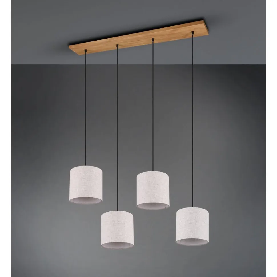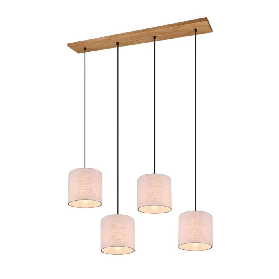 Natuurlijke materialen, zoals hout en stof, werken uitnodigend en creƫren een behaaglijke sfeer. De lampen van de serie ELMAU brengen een gezellige charme en een aangename lichtstemming uw huis binnen. Op de gang of in de woon- of slaapkamer, die lamp biedt veelzijdige toepassingsgebieden. De viervlammige hanglamp heeft een maximale hanglengte van 150 cm. De aparte lampenkappen hebben een diameter van 35 cm en de hoogte ervan kan individueel afgesteld worden. Het lichte design uit hout en beige stof laat zich gemakkelijk combineren met verschillende kleur- en inrichtingsconcepten. Voor een energiebesparende verlichting is het gebruik van een ledlichtbron aanbevolen. Deze zijn een optimaal alternatief voor gewone halogeenlampen en staan voor een hoge lichtkwaliteit en een energiebesparing van tot 80%. Bovendien profiteert u bij ledlichtbronnen van een lange levensduur, een geringe warmteontwikkeling en spaart tegelijkertijd het milieu.