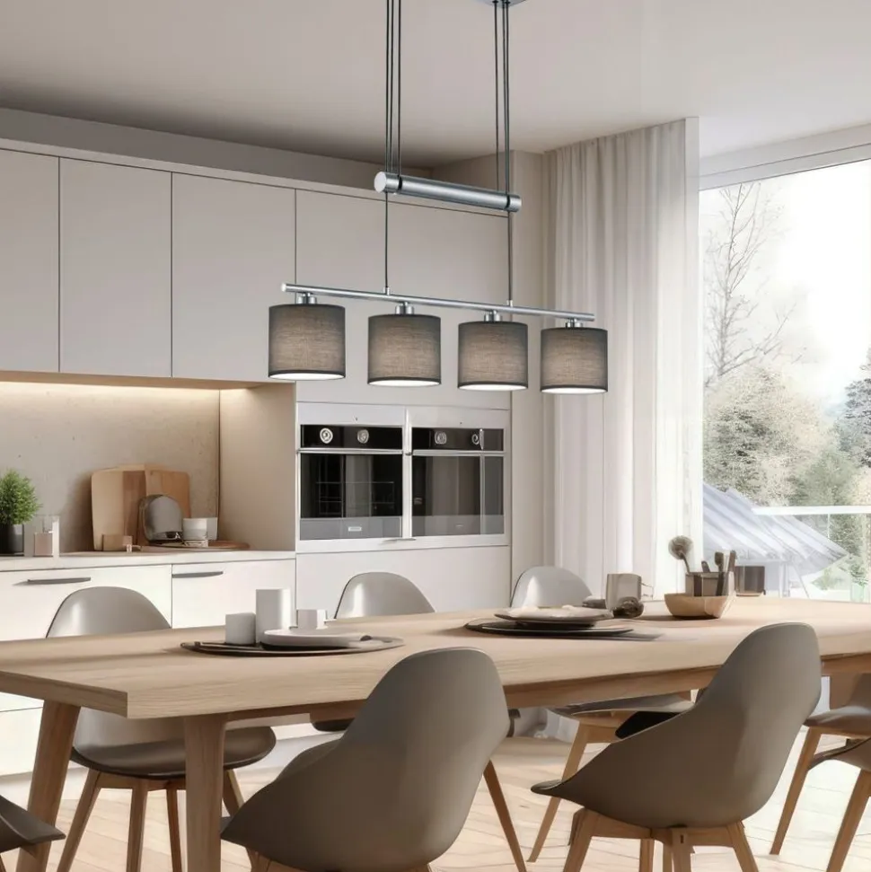 Een absolute alledaagse held en toch een decoratief woonaccessoire. De vier-lichts GARDA hanglamp kan in hoogte worden versteld naargelang je behoeften en omstandigheden. Zo kan ze boven elke eettafel worden geplaatst voor een optimale verlichting. De ophanglengte kan worden gevarieerd tussen 95 cm en 150 cm. Ze heeft een breedte van 77 cm en een diepte van 13,5 cm. Het metalen frame in mat nikkel en de stoffen tinten in grijs harmoniëren bijzonder goed met elkaar en passen goed bij een eenvoudige en moderne inrichtingsstijl. Voor een energiebesparende verlichting is het gebruik van een ledlichtbron aanbevolen. Deze zijn een optimaal alternatief voor gewone halogeenlampen en staan voor een hoge lichtkwaliteit en een energiebesparing van tot 80%. Bovendien profiteert u bij ledlichtbronnen van een lange levensduur, een geringe warmteontwikkeling en spaart tegelijkertijd het milieu.
