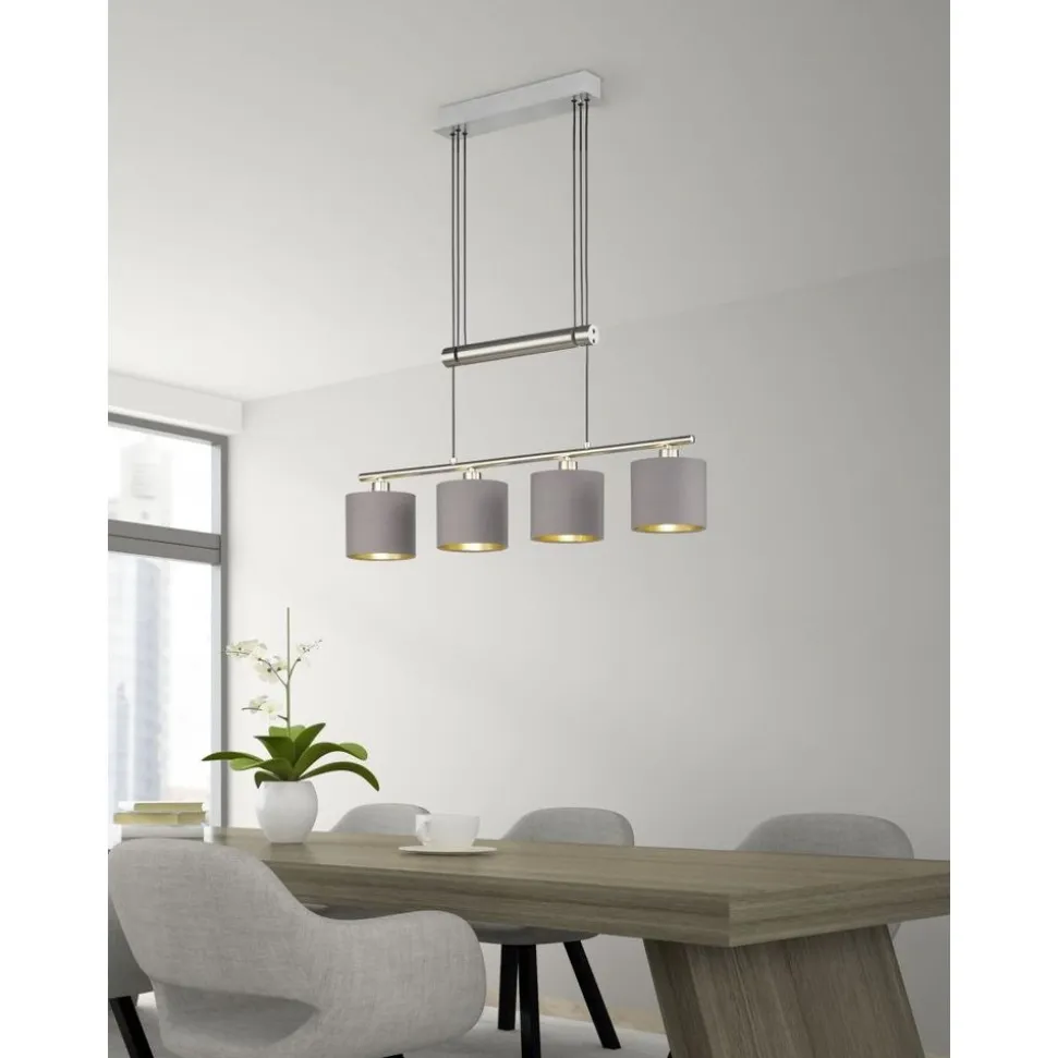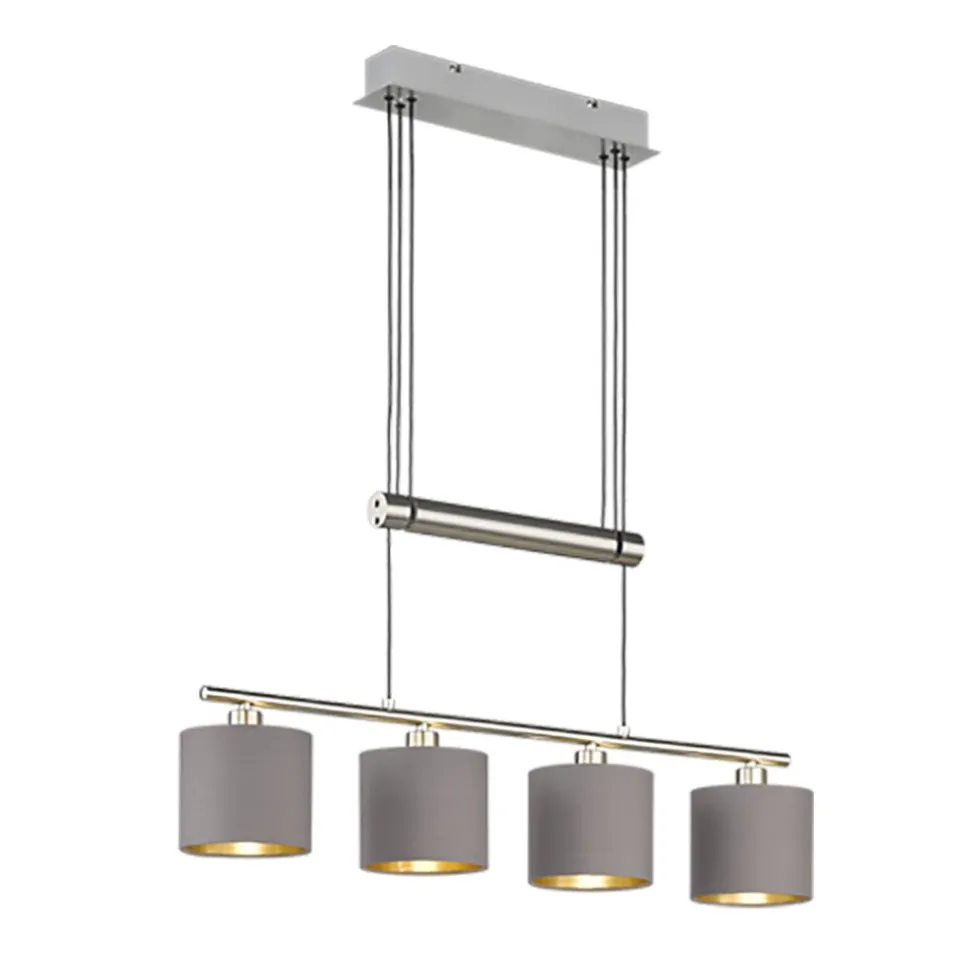 Gezellige verlichting in de eetkamer met de TRIO GARDA hanglamp. De vier-lichts JoJo hanglamp bepaalt vakkundig de sfeer in je woon- en eetkamer en maakt indruk met haar eenvoudige ontwerp. De vier stoffen kappen verspreiden een zacht licht en creƫren gezellige verlichting. Dankzij de jojo kan de hoogte van de lamp versteld worden tussen 95cm en 150cm en kan ze op elk moment aangepast worden. De pendel heeft een breedte van 77cm en komt daardoor goed tot zijn recht boven een langwerpige eettafel. De combinatie van mat nikkel en taupekleurige stoffen kappen ziet er elegant uit en de hanger heeft een speciale charme dankzij de goudkleurige coating aan de binnenkant van de stoffen kappen. Voor een energiebesparende verlichting is het gebruik van een ledlichtbron aanbevolen. Deze zijn een optimaal alternatief voor gewone halogeenlampen en staan voor een hoge lichtkwaliteit en een energiebesparing van tot 80%. Bovendien profiteert u bij ledlichtbronnen van een lange levensduur, een geringe warmteontwikkeling en spaart tegelijkertijd het milieu.