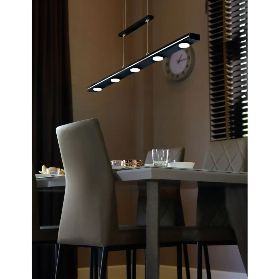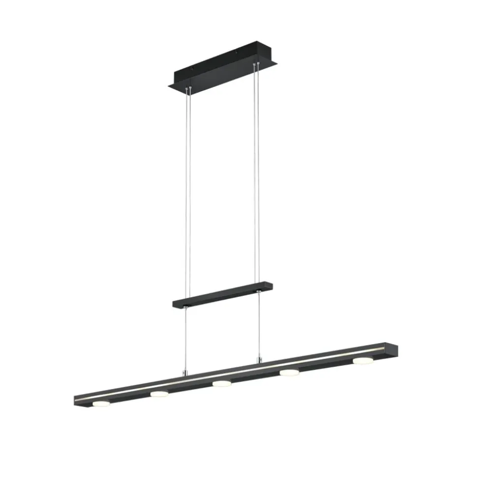 De hanglamp LACAL overtuigt door haar tijdloze look en een rechtlijnige vormgeving. Naast het stijlvolle uitzicht kan de lamp ook overtuigen met haar technische hoogtepunten: door middel van twee toetsen op de bovenkant van de lamp kunnen de helderheid en lichtkleur onafhankelijk van elkaar bestuurd worden. Kies uit drie helderheidsniveaus de juiste sfeer voor uw behoeften. De LACAL laat zich perfect boven de eettaffel plaatsen en kan door het strakke design uitstekend in verschillende inrichtingsstijlen geïntegreerd worden. Van de zeven lichtbronnen zijn er vijf ronde te vinden aan de onderkant van de lamp en twee rechthoekige aan de bovenkant. De hoogte van de hanglamp kan tussen 95 en 160 cm individueel versteld worden. De mat zwarte lamp komt elegant over en geeft door de lichtuittreding naar boven, alsook onderen een harmonieus totaalbeeld met een doelgerichte verlichting af. Daarnaast beschikt de lamp over een moderne ledtechnologie die zich onderscheidt met een hoge lichtkwaliteit en energie-efficiëntie. In vergelijking met gewone halogeenlampen kan tot 80% bespaard worden op de energiekosten. Bovendien hebben ledlampen een lange levensduur, produceren minder warmte en zijn milieuvriendelijk.