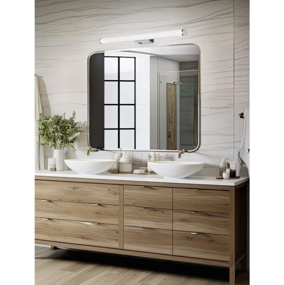 De eenvoudige MATTIMO wandlamp past mooi in het gewenste toepassingsgebied. Dankzij de IP44-beschermingsgraad is de lamp beschermd tegen spatwater en kan ze probleemloos worden gebruikt in vochtige ruimtes zoals de badkamer. Het langwerpige ontwerp is ideaal naast of boven de spiegel in de wasruimte en zorgt voor stijlvolle accenten. De lamp kan zoals gebruikelijk worden in- en uitgeschakeld met de wandschakelaar of via een geïntegreerde schakelaar op de lamp. De combinatie van chroommetaal en wit kunststof past harmonieus in het geheel. De armatuur is ook voorzien van moderne LED-technologie, die wordt gekenmerkt door een hoge lichtkwaliteit en energie-efficiëntie. Vergeleken met conventionele halogeenlichtbronnen kan tot 80% op de energiekosten worden bespaard. LED lichtbronnen hebben ook een lange levensduur, produceren minder warmte en beschermen het milieu.