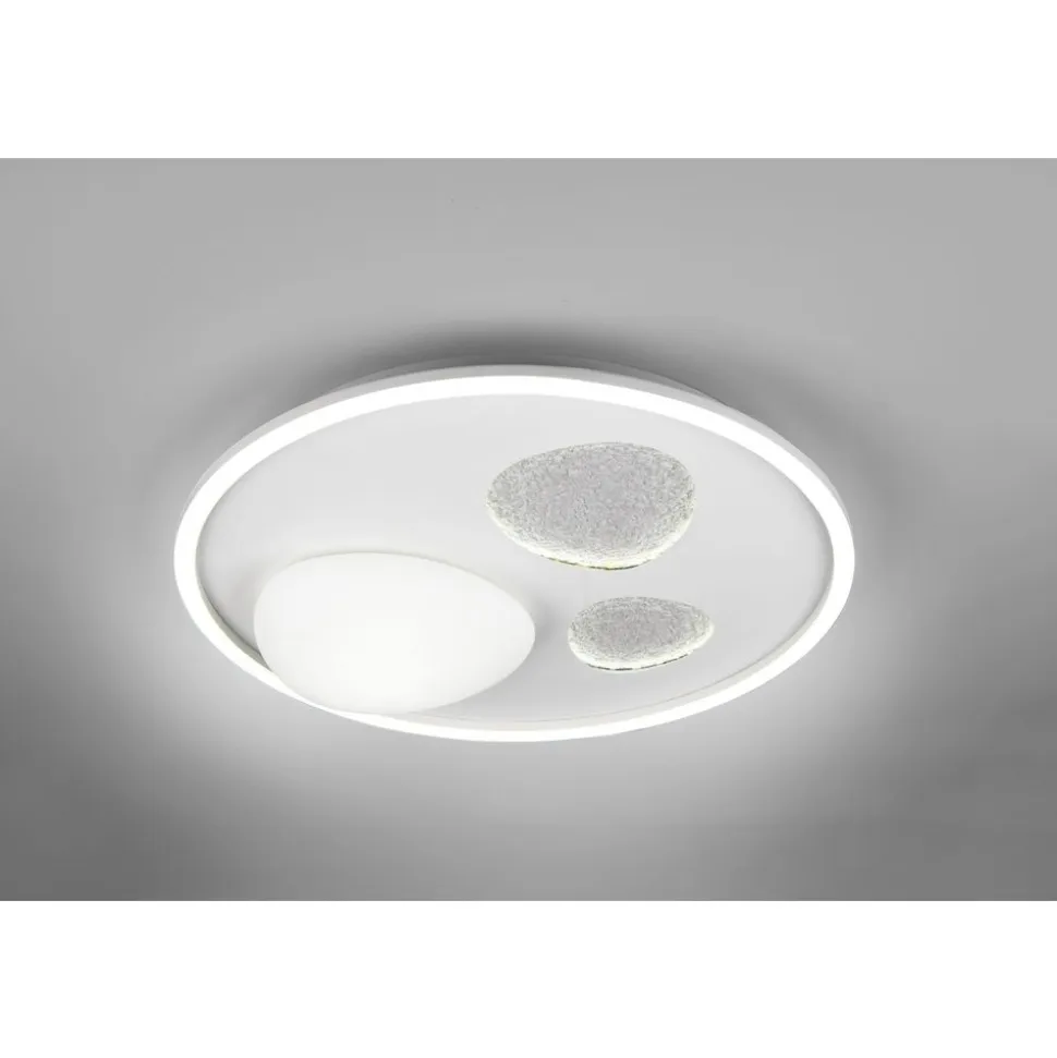 Met haar unieke structuren en zachte, diffuse licht brengt plafondlamp PEBBLE een vleugje kosmische fascinatie in huis. De twee openingen met een maanachtige structuur zijn bijzonder opvallend. Deze speciale structuur creëert fascinerende licht- en schaduweffecten die doen denken aan het mysterieuze oppervlak van de maan en een unieke sfeer creëren. Je kunt de lichtkleur en helderheid eenvoudig en traploos aanpassen met de meegeleverde afstandsbediening. De lamp is verkrijgbaar in een stijlvolle combinatie van mat wit en grijs metaal en kan daarom perfect worden geïntegreerd in het kleurenschema van je kamer. Terwijl het matte wit zorgt voor een heldere en vriendelijke uitstraling, voegt het grijs elegante en moderne accenten toe. De armatuur is ook voorzien van moderne LED-technologie, die wordt gekenmerkt door een hoge lichtkwaliteit en energie-efficiëntie. Vergeleken met conventionele halogeenlichtbronnen kan tot 80% op de energiekosten worden bespaard. LED lichtbronnen hebben ook een lange levensduur, produceren minder warmte en beschermen het milieu.