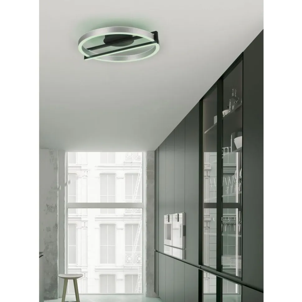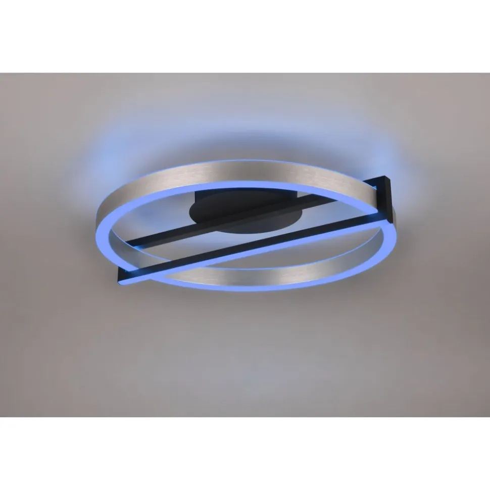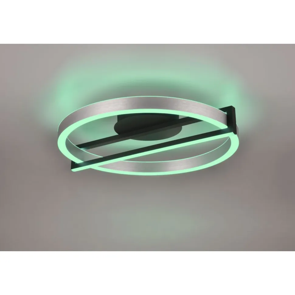 De plafondlamp THOMPSON is een futuristische inspiratie met een unieke verlichtingsflair. Het samenspel van geometrische vormen, directe en indirecte verlichting en meerkleurig licht dankzij de RGBW-kleurenwisselaar verandert je woonkamer in je nieuwe favoriete plek. Zodra je op de bank bent gaan zitten, is het puur comfort om de helderheid en lichtkleur naar wens te kunnen aanpassen zonder weer op te hoeven staan. Dankzij de THOMPSON afstandsbediening kun je dimmen, de lichtkleur instellen en de RGBW kleurwisselaar op afstand bedienen. De intelligente WiZ-technologie van de plafondlamp biedt ook onbeperkte mogelijkheden voor slimme verlichtingsbediening via app of spraakbesturing en de creatie van fascinerende verlichtingsontwerpen. Profiteer van de visuele en functionele eigenschappen van THOMPSON in je huis! Het kleurenschema in mat zwart en geborsteld aluminium is onopvallend en laat het opvallende ontwerp en de vele functies van de lamp stralen. De armatuur is ook voorzien van moderne LED-technologie, die wordt gekenmerkt door een hoge lichtkwaliteit en energie-efficiëntie. Vergeleken met conventionele halogeenlichtbronnen kan tot 80% op de energiekosten worden bespaard. Met LED lichtbronnen profiteert u ook van een lange levensduur en een lage warmteontwikkeling, terwijl het milieu wordt beschermd.