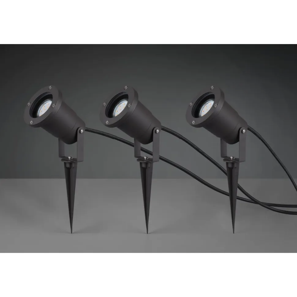 Uitnodigend en effectief – de UBANGI buitenlampen plaatsen sfeervolle lichtaccenten rond het huis. De decoratieve set van drie heeft een vijf meter lange voedingskabel en drie meter lange kabelverbindingen tussen elke spot. Elke spot heeft een grondspike zodat ze flexibel en gemakkelijk in je tuin geplaatst kunnen worden. Elke spot heeft een diameter van ongeveer 9 cm en is zeer weerbestendig dankzij de IP65 beschermingsgraad. Dankzij de discrete antracietkleur kunnen de buitenlampen stijlvol worden geïntegreerd in verschillende tuinconcepten. Voor een energiebesparende verlichting is het gebruik van een ledlichtbron aanbevolen. Deze zijn een optimaal alternatief voor gewone halogeenlampen en staan voor een hoge lichtkwaliteit en een energiebesparing van tot 80%. Bovendien profiteert u bij ledlichtbronnen van een lange levensduur, een geringe warmteontwikkeling en spaart tegelijkertijd het milieu.