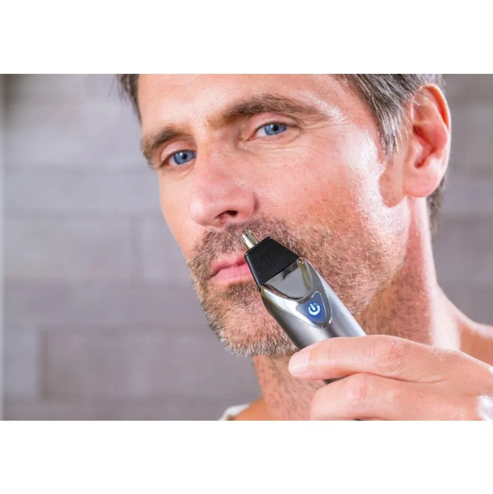 4 opzetstukken: trimmermes (30 mm), T-mes (40 mm), foliescheerapparaat, roterende kop voor neus en oor.