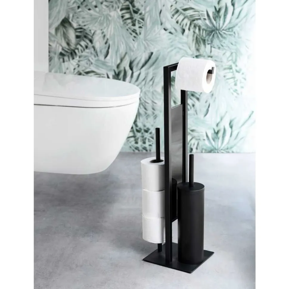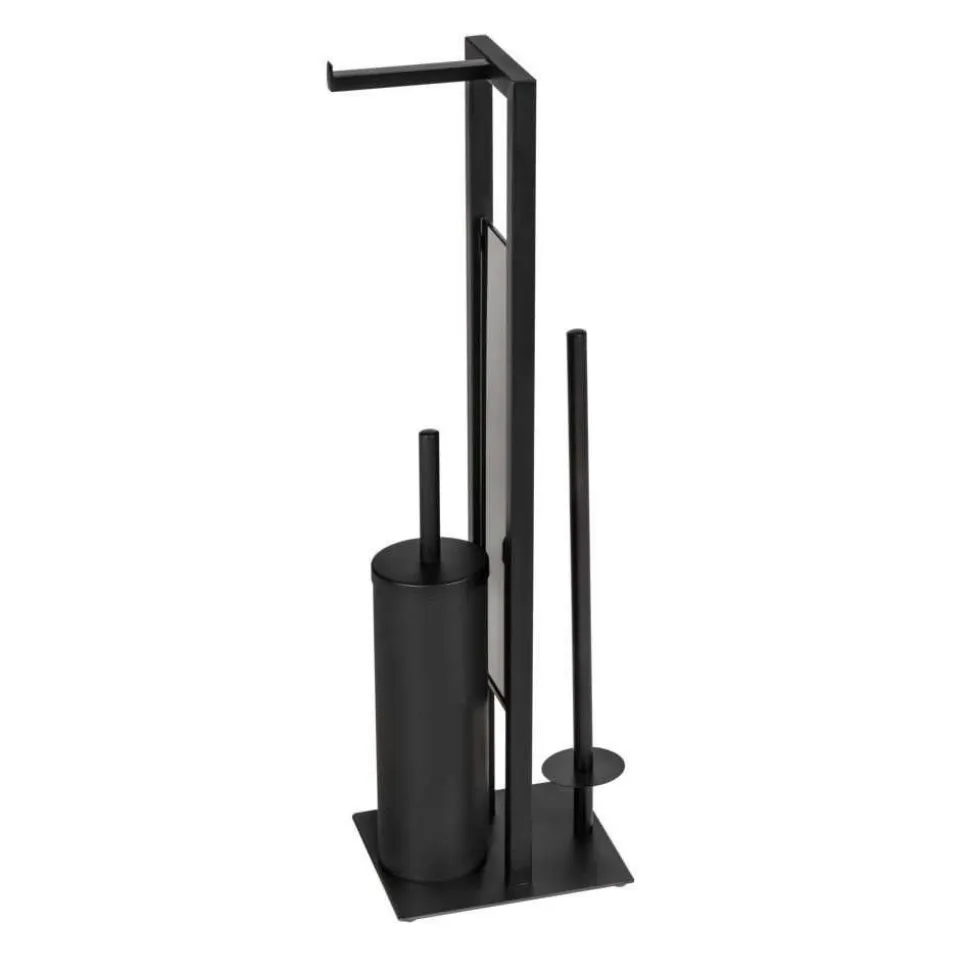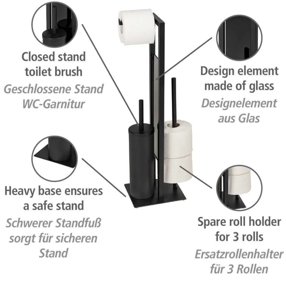 De zwarte toiletset Rivalta van WENKO verenigt meerdere handige functies. Een toiletborstel, een wc-papierhouder en een reserverolhouder vormen samen een even nuttig als decoratief geheel voor uw badkamer. Het staande wc-garnituur Rivalta is gemaakt van gelakt staal en overtuigt door de eenvoudige elegantie. De bodemplaat en de glazen scheidingswand zijn gemaakt van zwaar veiligheidsglas in zwart. Deze geven de set een afgerond uiterlijk en zorgen ervoor dat deze stevig staat. Naast het toilet hebt u met de 3-in-1 set altijd alle belangrijke toiletartikelen bij de hand. Het papier kan gemakkelijk worden afgerold van de wc-papierhouder aan de bovenkant. Onderaan bevindt zich de houder voor de wc-borstel, die met zijn siliconen borstelkop zorgt voor een hygiënische reiniging van het toilet. De gesloten houder beschermt de nuttige borstel tegen nieuwsgierige blikken. De borstelkop (Ø 7,5 cm) is vervangbaar. Als het toiletpapier op is, kunt u meteen een nieuwe rol op de houder doen. Achter het zwarte scheidingsglas kunnen verschillende reserverollen op een houder opgeborgen worden. Dit is niet alleen heel praktisch, maar bespaart ook ruimte in de kast of waar u het toiletpapier gewoonlijk ook opbergt. Dankzij de hoekige basisvorm kunt u de gesloten toiletset Rivalta met zijn afmetingen (B × H × D) 18 × 70 × 23 cm probleemloos in hoeken neerzetten. Maar ook vrijstaand slaat de set een elegant figuur. Met het even eenvoudige als elegante design past toiletset Rivalta van WENKO in matzwart in vele interieurstijlen. Het roestvrijstalen Wenko wc-garnituur Rivalta in mat zilver is geschikt voor badkamers met lichte kleuren. De toiletset is verkrijgbaar in vele andere varianten – waaronder een uitvoering met een open toiletborstelhouder.