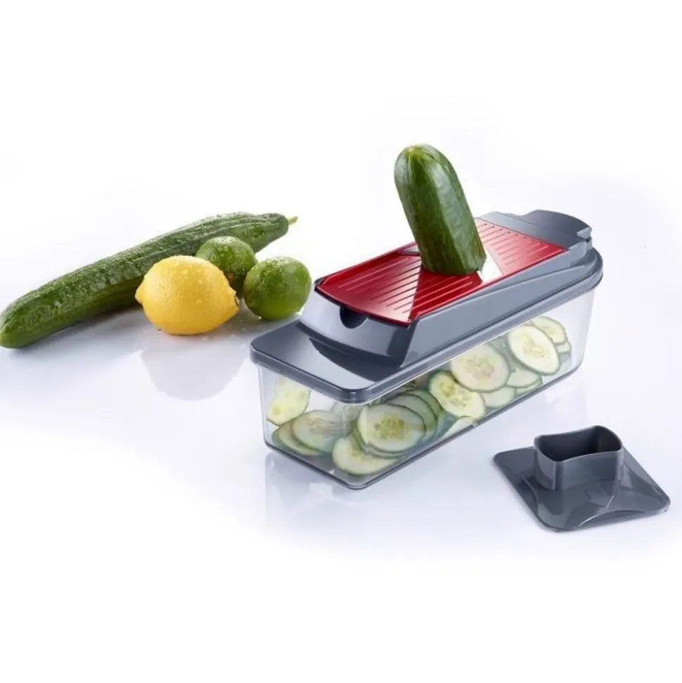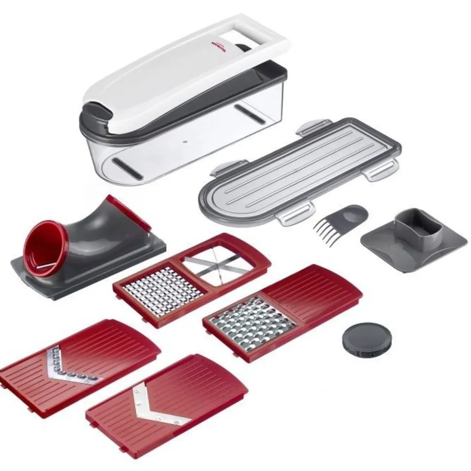 • Met diverse snij-units voor blokjes, pennen of stukjes, een snijmachine, een rasp, een kleurensnijder en een julienne- en spiraalsnijder, een opvangbak met luchtdicht vershouddeksel en rubberen voetjes, twee resthouders voor veilig bereiden en een schoonmaak kam