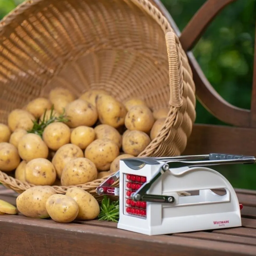 Fritesnijder & groentestickler biedt een breed scala aan toepassingsmogelijkheden voor hedendaagse voeding • Snijden van frites en groenten en fruit (bijv. voor salades en dipsauzen) • Gemaakt van bijzonder hoogwaardig kunststof • Met 3 roestvrijstalen mesinzetten voor verschillende snijden diktes (12 x 12 mm, 10 x 10 mm, 9 x 9 mm) • massief stalen drukbeugel • zeer effectieve zuignap