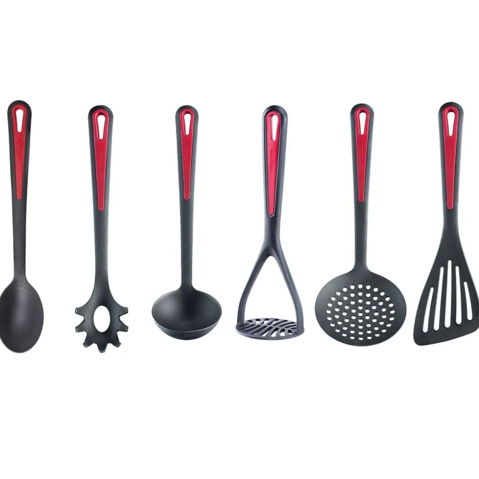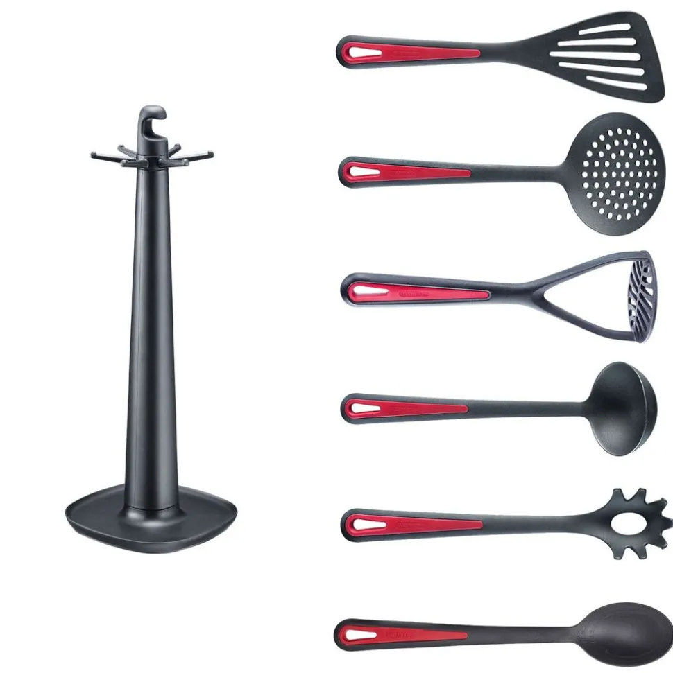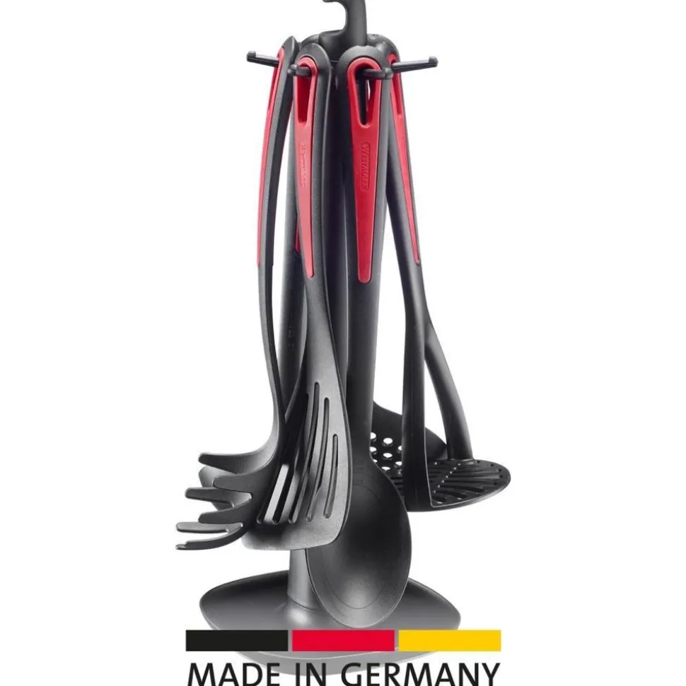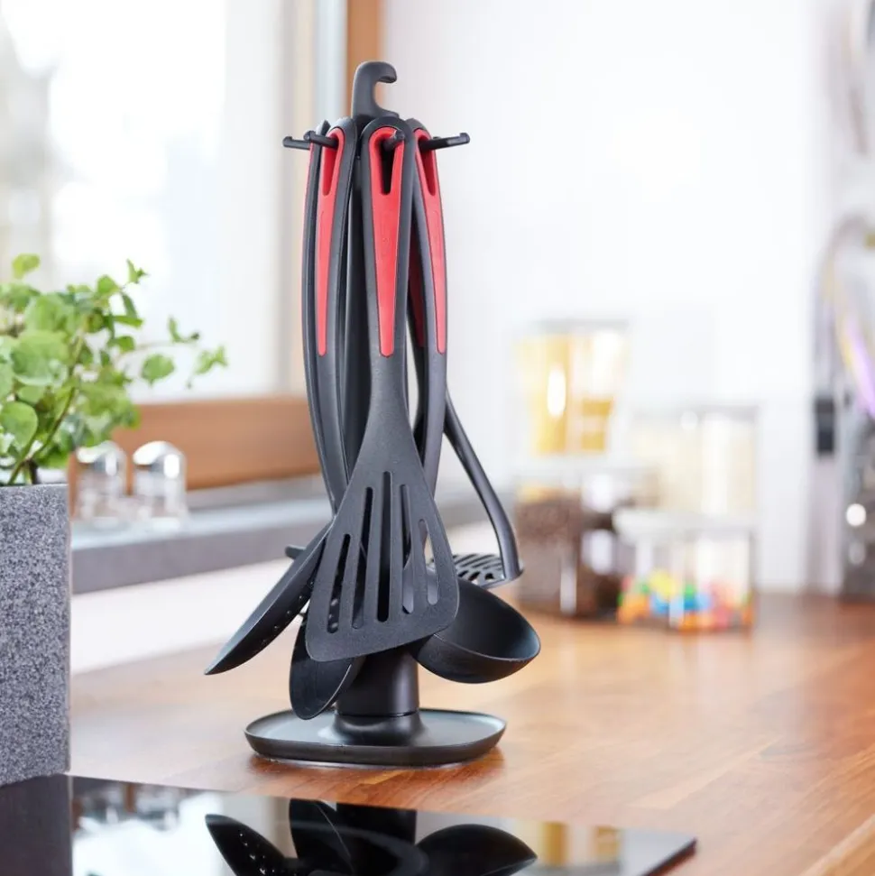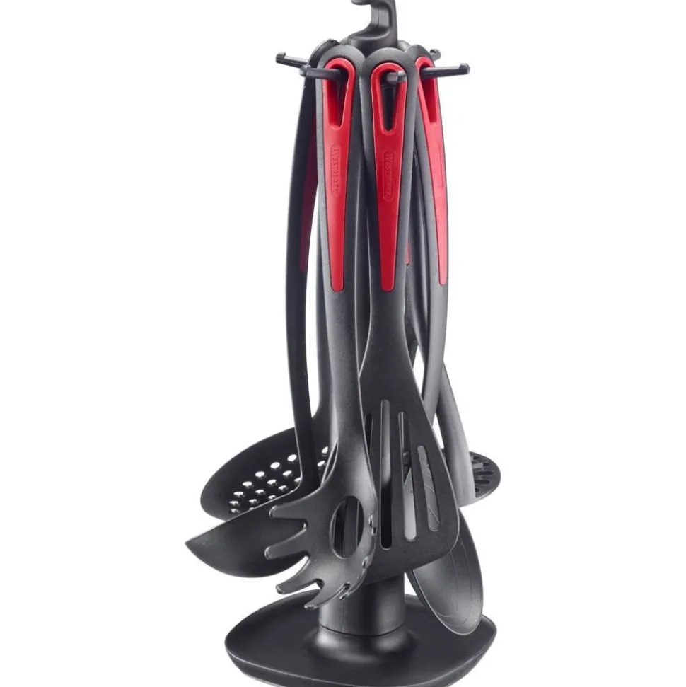 De 6-armige standaard voor het ophangen van veel keukenbenodigdheden is voorzien van een draaggreep en kan daardoor eenvoudig worden vervoerd. Hij kan ook worden gedraaid, zodat u gemakkelijk bij de gewenste keukenhulp kunt. Met dit kookbestek heeft u voor elke situatie de juiste keukenhulp bij de hand – of het nu gaat om pureren, serveren of omdraaien. Ideaal voor antiaanbaklagen. De set bevat een aardappelstamper, een braadlepel, een groentelepel, een spaghettilepel, een soeplepel, een schuimspaan en een spatel – alles wat u nodig hebt voor het koken en bereiden.