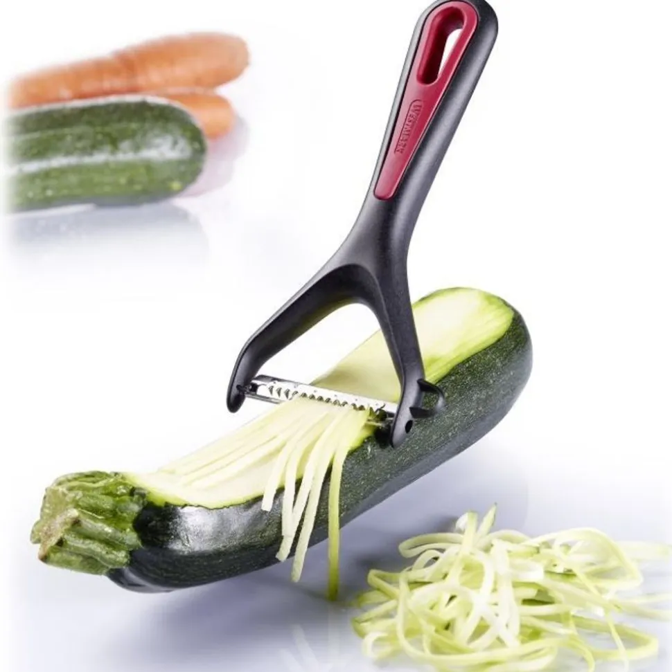 De juliennesnijder “Gallant” in eenvoudig zwart design is perfect voor het snijden van fijne groentereepjes voor het decoreren van soepen of het bereiden van wokmaaltijden. Met zijn scherpe tanden zijn de groenten in een mum van tijd met weinig moeite in reepjes te snijden. De scherpe koekjesvormer helpt bij het verwijderen van beschadigde plekken en lelijke vlekken. Hij is gemakkelijk schoon te maken, vaatwasmachinebestendig en dankzij de ophanglus plaatsbesparend op te bergen – zodat de keuken na het koken snel weer opgeruimd is.