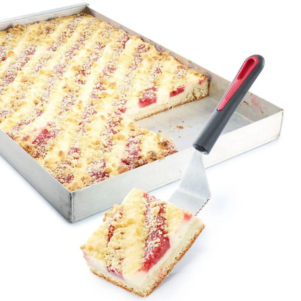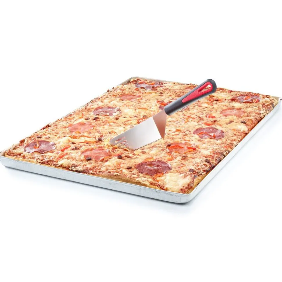 • zeer scherp gekarteld mes voor het snijden • breed steunvlak voor het serveren van pizza, taarten, ovenschotels etc. • door de hoek ook ideaal voor diepe kook- en bakgerechten|