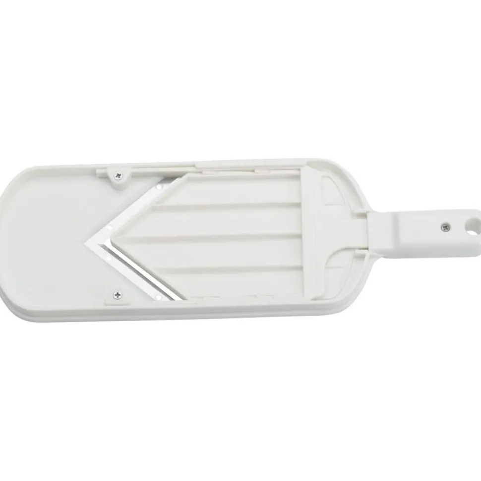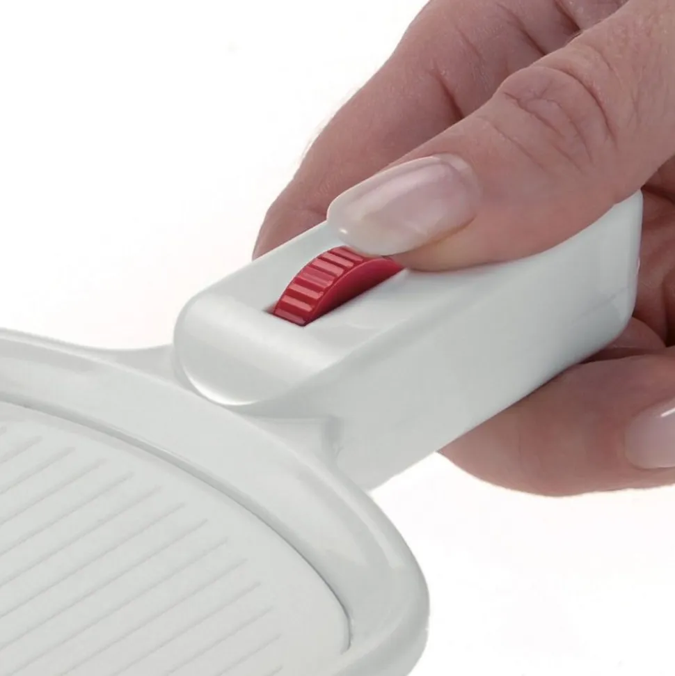 De hoogwaardige groentesnijder V-Hobel is uitgerust met een zeer scherp, V-vormig mes van roestvrij staal en maakt moeiteloos, snel en geruisloos snijden en snijden van fruit en groenten mogelijk. De snijdikte kan naar wens worden ingesteld van 1-3 mm met behulp van het wiel in de handgreep. De meegeleverde schroothouder zorgt voor veilig snijden zonder risico op letsel.