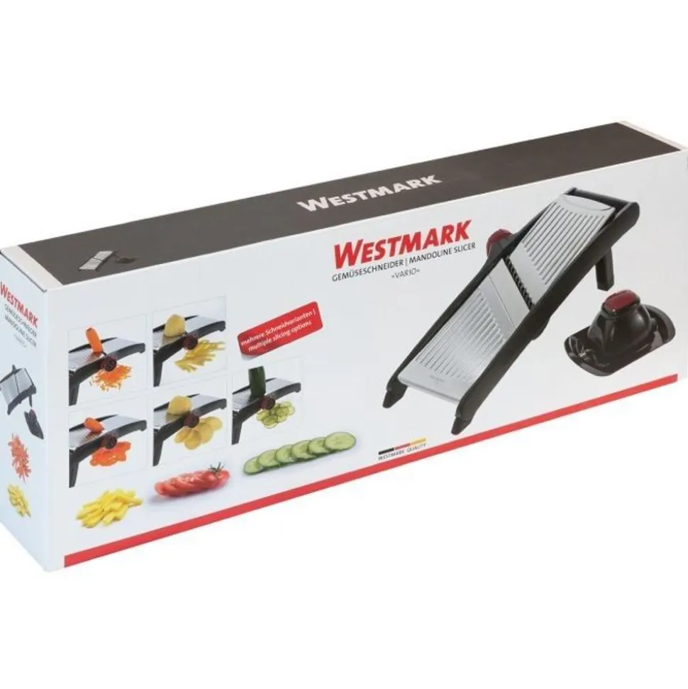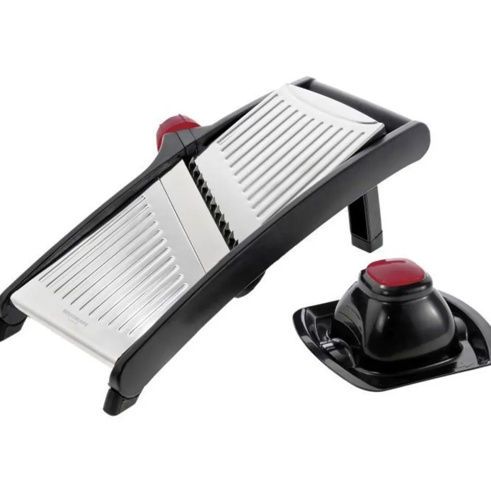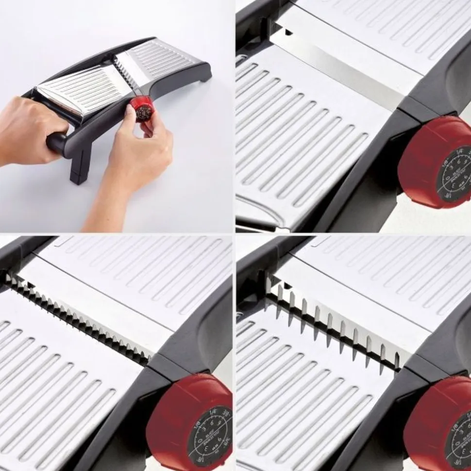 Meerdere snijmogelijkheden in één apparaat. Geen moeizaam gebruik van verschillende messen. Druk eenvoudig op de instelknop en draai deze met de klok mee om de gewenste snijvariant te selecteren. Kies tussen grove en fijne julienne (grove julienne – ideaal voor frites) en plakjes van verschillende diktes. Bescherm uw vingers door altijd !! gebruik de voedselhouder bij het verwerken van kleinere groenten of stukjes fruit. Reiniging: klap de achterste roestvrijstalen plaat omhoog voor reiniging. De messen zijn nu zichtbaar. Reinig het apparaat en de messen met een vochtige doek, eventueel gedrenkt in afwaswater – vooral voor het eerste gebruik. Spoel daarna opnieuw af met schoon water. Zorg ervoor dat er geen water op de instelknop komt. Het is het beste om het apparaat tijdens het spoelen een beetje schuin te houden. Let op – kans op letsel: de messen zijn erg scherp. Wees zeer voorzichtig bij het schoonmaken. Het apparaat mag nooit in handen van kinderen komen.