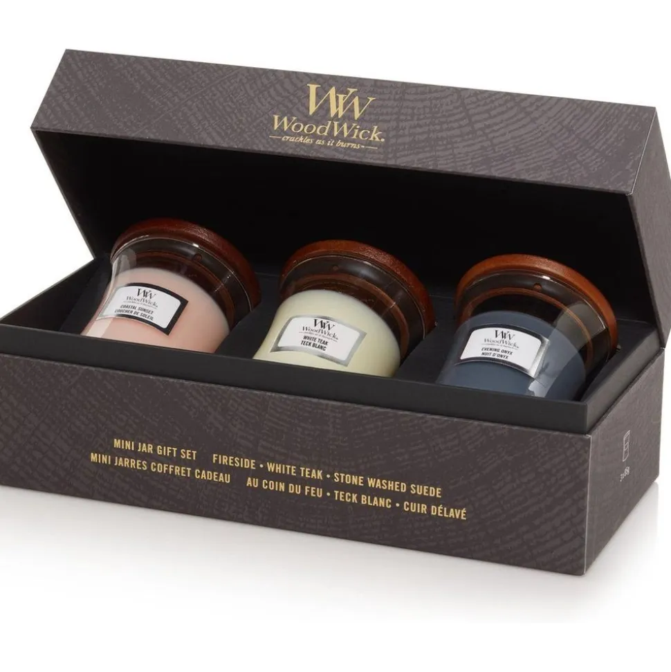 WoodWick biedt een elegante geschenkoptie voor elke gelegenheid. Een onderscheidend patroon en satijnen linten creƫren een verfijnde esthetiek en verwijzen naar de luxe beleving van de WoodWick geurkaarsen.