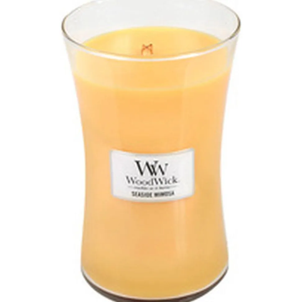 De mini Woodwick kaars met de geur Seaside mimosa neemt je mee naar een zomers strand. De geur mix van sappige citrus en champagne druiven doet je denken aan een heerlijk verfrissend drankje op het strand. Deze kaars is de kleinste Woodwick kaars die is voorzien van het stijlvolle glas en houten deksel. Deze kaars geeft je minimaal 20 uur lang het plezier van deze heerlijke geur.