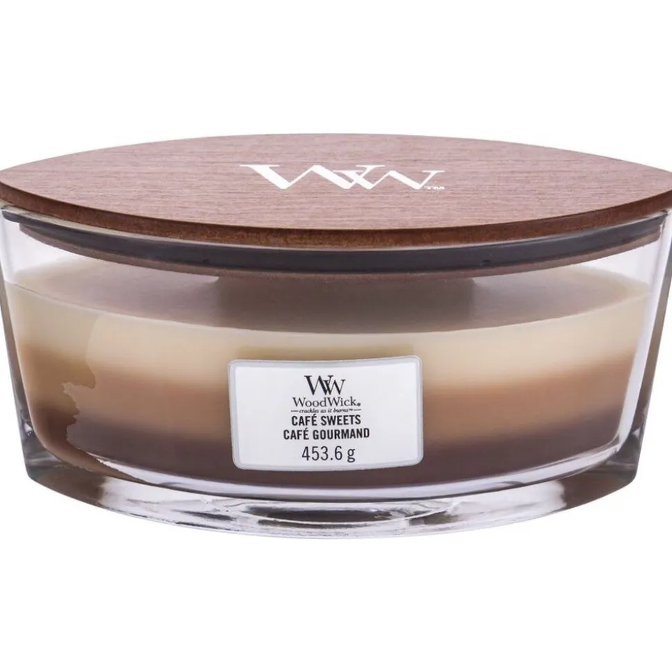 De WoodWick Trilogy Hourglass Ellipse geurkaars – Café Sweets creëert een unieke geurbeleving terwijl de lagen samensmelten.