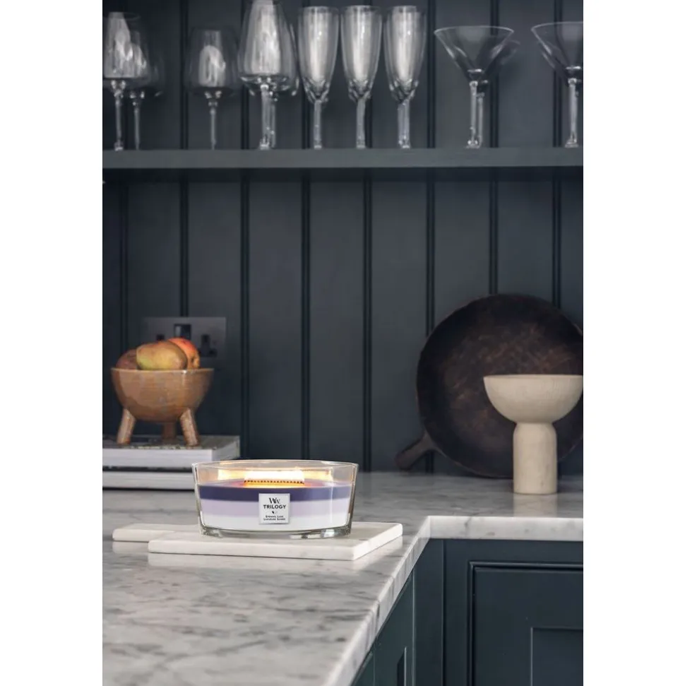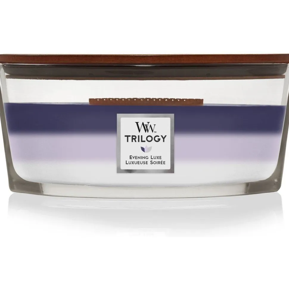 De WoodWick Trilogy Heartwick Ellipse geurkaars – Evening Luxe creeërt een unieke geurbeleving als lagen samensmelten.