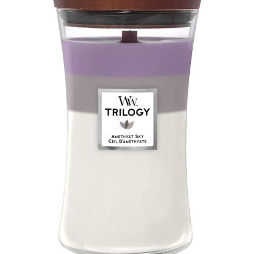 De WoodWick Amethyst Sky Geurkaars is een bloemige geur. De geurkaars heeft een ronde vorm als een zandloper en een houten deksel. De kaars heeft een houten lont die knettert als je hem aansteekt.