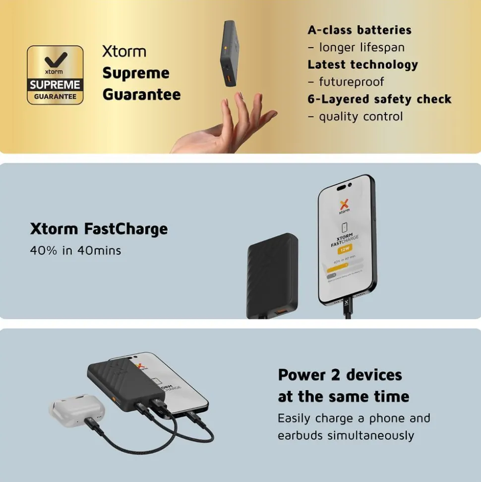 Dankzij de ingebouwde mechanismen kunt u deze Power Bank jarenlang veilig gebruiken. De Powerbank zelf en de aangesloten apparaten zijn beveiligd tegen kortsluiting, oververhitting en overladen. Dankzij de 6-laagse veiligheidscontrole van Xtorm is dit de Power Bank Go2 voor al uw dagelijkse oplaadbehoeften! Dankzij uitgebreide kwaliteitscontrole bent u verzekerd van een veilige en hoogwaardige Power Bank voor dagelijks gebruik.