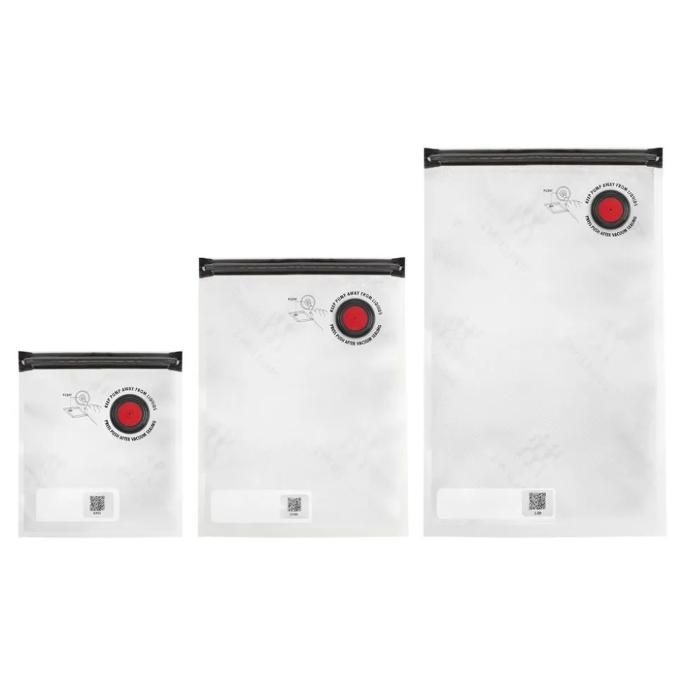 - Set van 4 vacuümzakken in formaat S (inhoud: 1,25 l, afmetingen: 23 x 20 cm (L x B)), 4 vacuümzakken in formaat M (inhoud: 4 l, afmetingen: 35 x 25 cm (L x B)) en 2 vacuümzakken in formaat L (inhoud: 8,5 l, afmetingen: 49 x 30 cm (L x B))